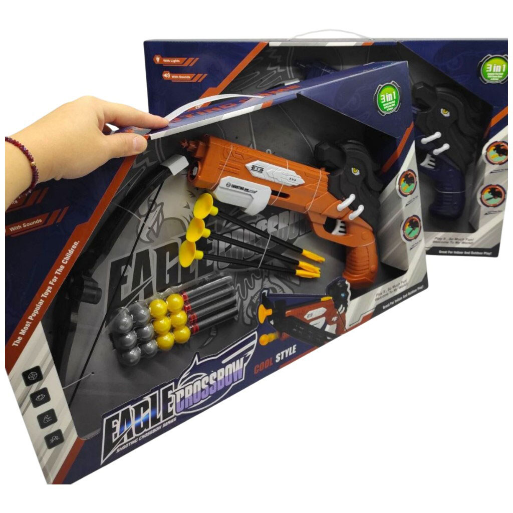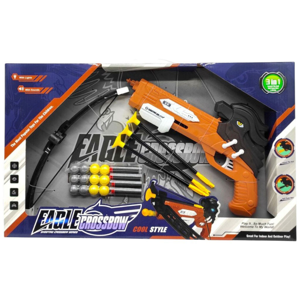 Арбалет, 3 режима стрельбы, подсветка, механический принцип работы, звук орла, 3 стрела с присосками, 4 мягких патрона, 12 пластиковых шариков, Mic