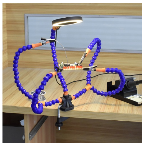 Держатель плат для пайки, более известный как “третья рука” – удобное решение для ремонта электронных плати и микросхем. Держатель имеет большое количество регулируемых валов типа “гусиная шея”, которые позволяют крепить, поворачивать и наклонять ремонтируемую плату в любом удобном положении или направлении. Несомненным преимуществом держателя является наличие лупы с интегрированной LED-подсветкой, которая имеет несколько температурных режимов и уровней яркости. Фиксация держателя на рабочей поверхности происходит с помощью быстрозажимной струбцины, которая позволит оперативно и надежно зафиксировать держатель в необходимом месте.
