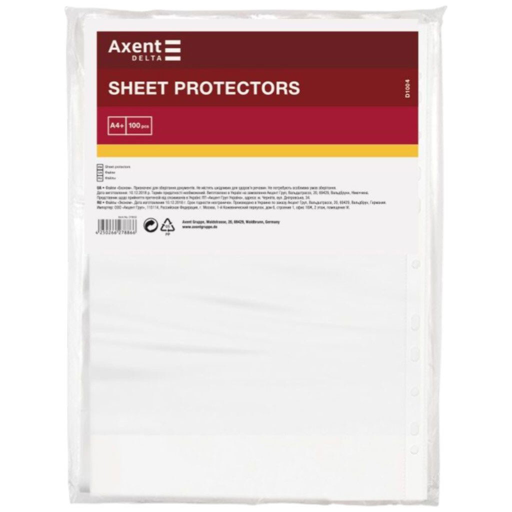 Файл А4+, глянцевый, прозрачный, 40 мкм, Axent