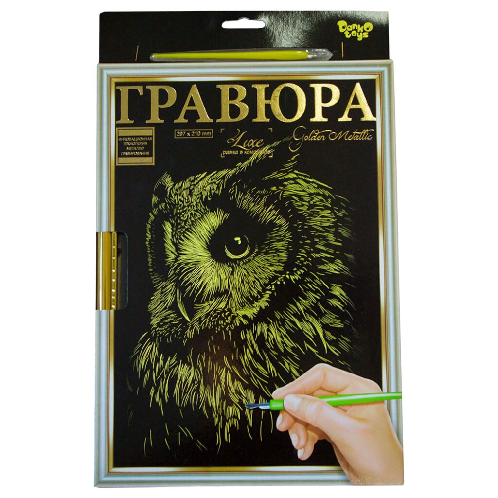 Гравюра "LUXE А4" с рамкой "Golden Metallic: Сова" от Dankotoys - элегантный набор для творчества, позволяющий создать изображение с металлическим блеском. Процесс работы помогает развивать внимательность, усидчивость и навыки.