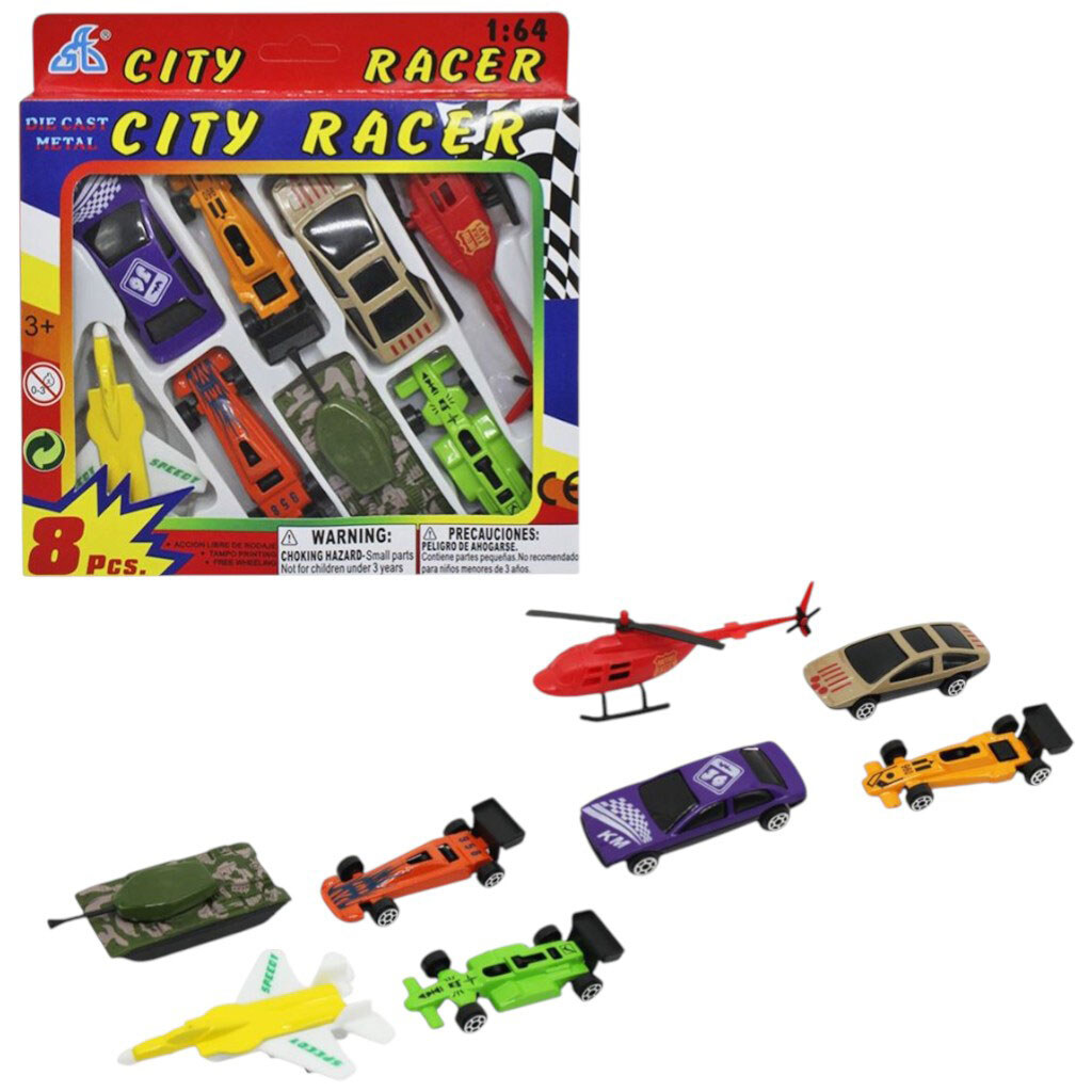 Примечание: Упаковка: Коробка | Вес в упаковке: 90 г | Габариты в упаковке: 2 x 17 x 17 см | Габариты без упаковки: 2 x 7 x 2.5 см | Страна производитель: Китай | Комплектация: самолет, 3 гоночные машинки, танк, легковая машина, спортивная машина и вертолет.