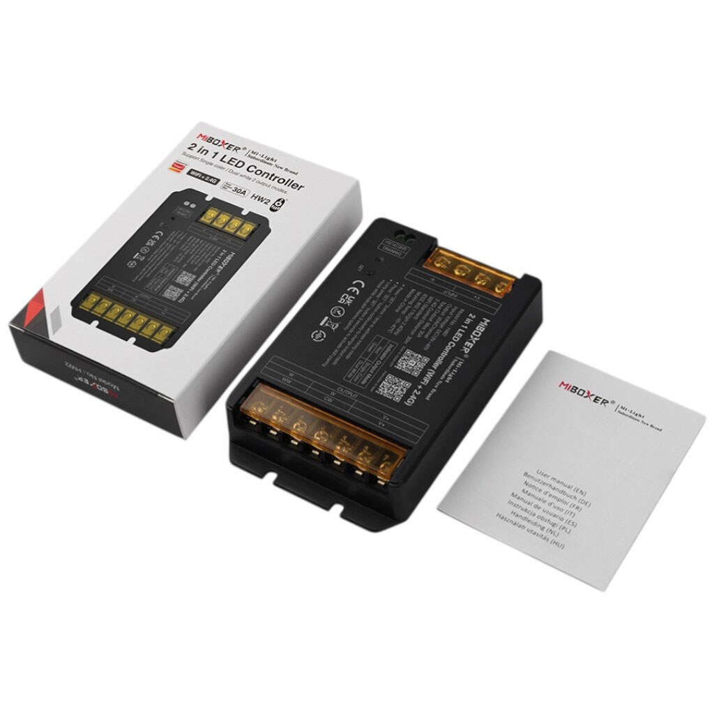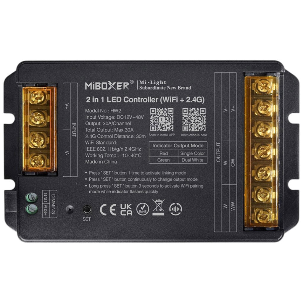 Примечание: Описание: Контроллер освещения 2В1 WiFi + 2.4GHz. 2 режима выхода: Single Color/Dual White. Поддерживает WiFi, Bluetooth 4.2 и RF 2.4G, что обеспечивает стабильное соединение даже без маршрутизатора. Управление через Tuya Smart App. Функции: беспроводное дымирование, групповое и сценное управление, таймер, музыкальный режим, биоритм, авторетрансляция сигнала до 30m. Поддерживает PUSH Dimming, переключение PWM High/Low, режим Do Not Disturb для энергосбережения. Совместим с 2.4G пультами FUT006, FUT007, B1/T1, B2/T2, K1, FUT087, S1, WL-Box1. Выход: 30А на устройство. Питание: 12/48VDC. Габариты 134x81x24mm