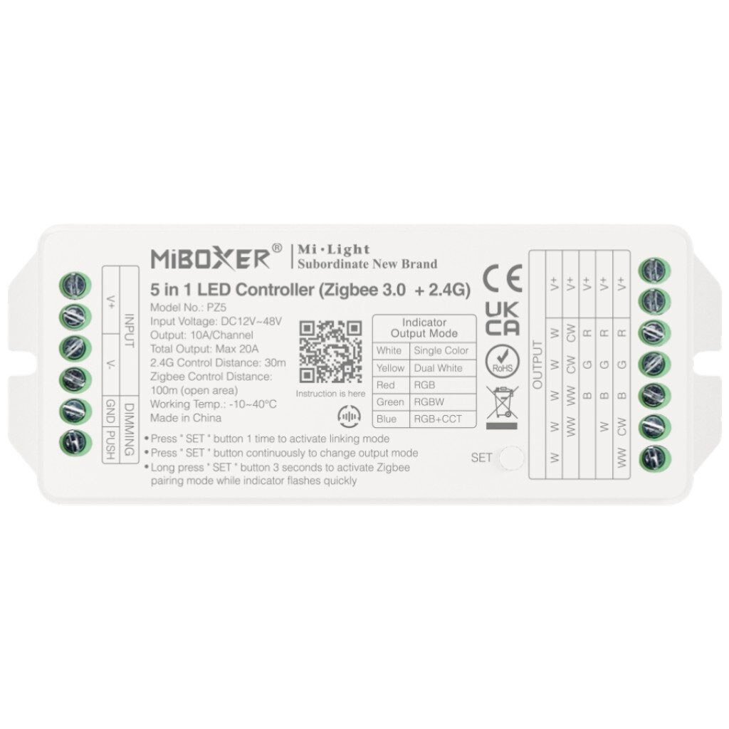 Примечание: Описание: Контроллер освещения 5в1 Zigbee 3.0+2.4GHz. 5 режимов выхода: Single Color, Dual White, RGB, RGBW, RGB+CCT. Поддерживает Zigbee 3.0 и RF 2.4GHz управление с дистанцией до 100m (Zigbee) и 30m (2.4G). Регулировка яркости, цвета, насыщенности и температуры до 16 млн цветов. Поддерживает PUSH Dimming, автоматическую ретрансляцию сигнала и синхронизацию, переключение PWM High/Low, режим Do Not Disturb для энергосбережения. Совместим с пультами FUT100, FUT089, FUT092, FUT096, B-серии. Управление через MiBoxer Zigbee Gateway, Philips Hue, Alexa, Google Home. Питание: 12-48VDC. Ток: 10A/канал (20A на устройство). Габариты 119x47x23mm