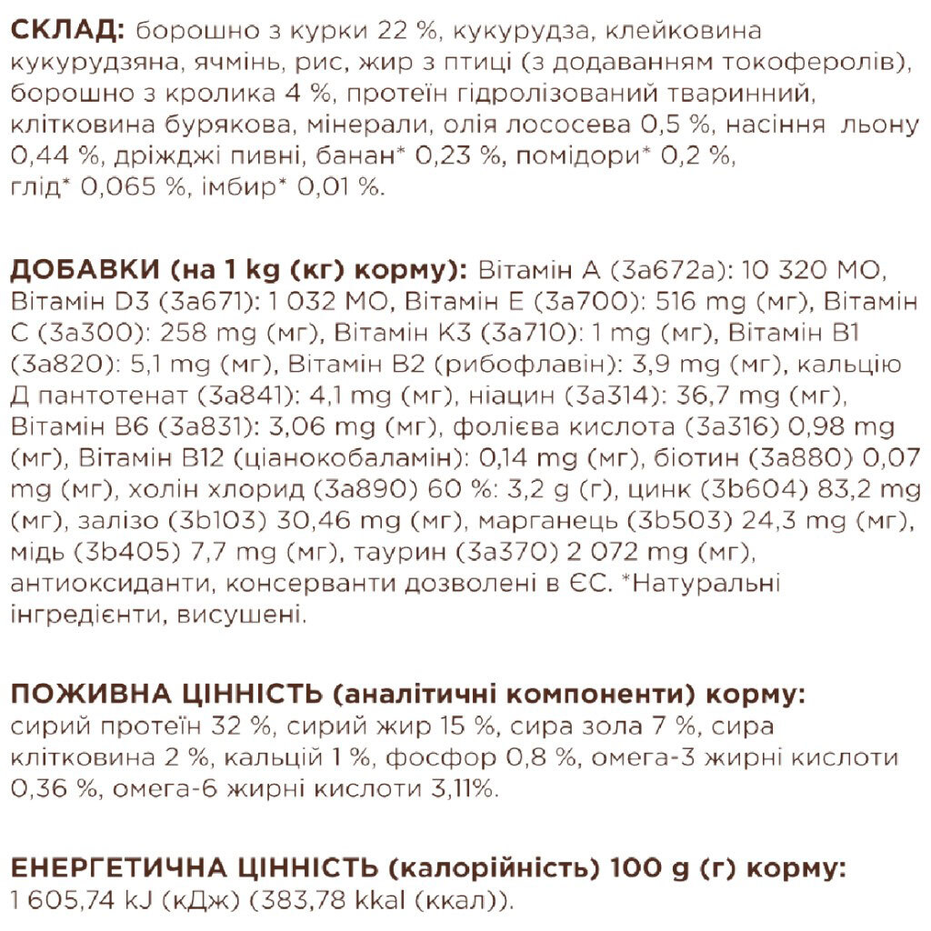 Примечание: Возраст животного: Взрослые | Вес: 300 г | Вид животного: Коты | Страна производитель: Украина | Назначение: Для ежедневного рациона | Срок годности: 18 месяцев | Тип корма: Сухой