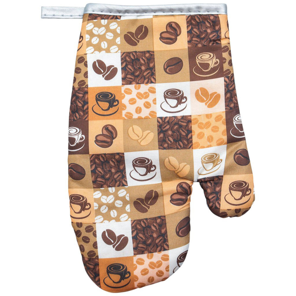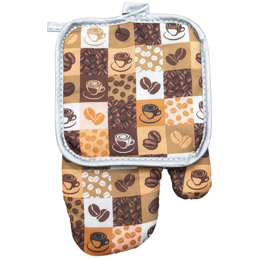 Примечание: Комплектация: Перчатка, прихватка | Страна производитель: Китай | Материал: 65% полиэстер, 35% хлопок | Размер: Перчатка: 25х17 см, прихватка: 17х17 см