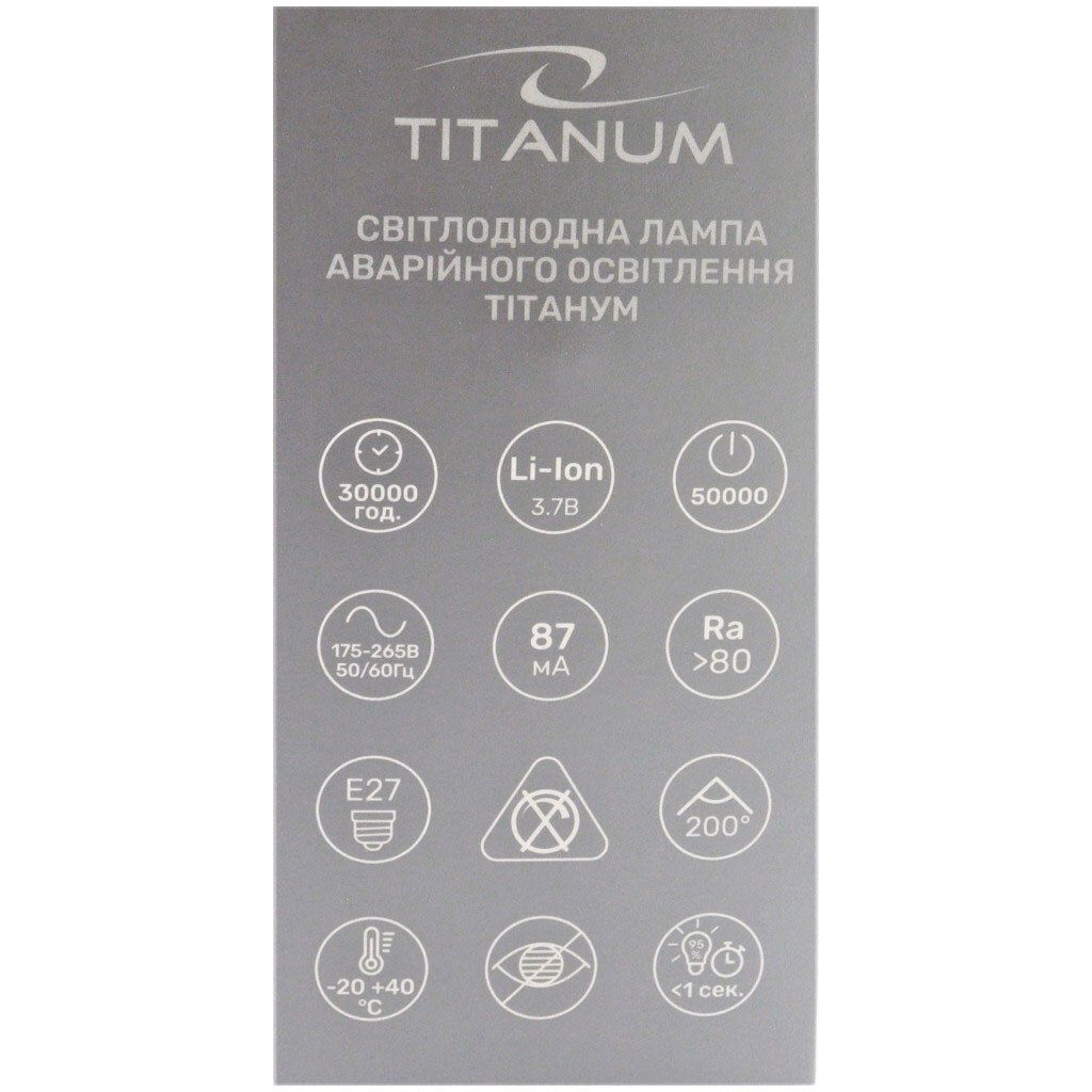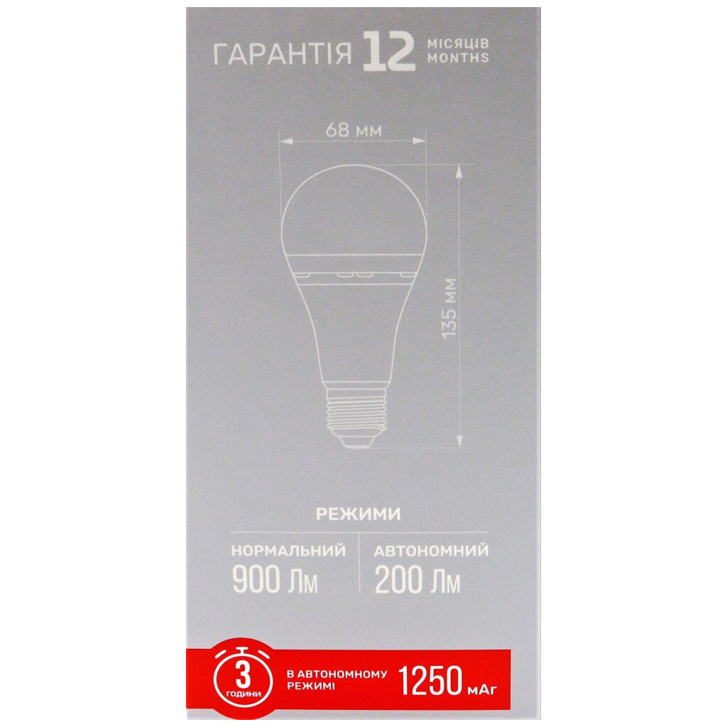Примечание: Емкость аккумулятора: 1250 | Входное напряжение, V: 175-265 | Гарантийный термин: 12 месяцев | Питание: От сети, аккумулятор | Количество режимов: 2 | Количество циклов включения (On/Off): 50 000 | Цвет свечения: Белый | Страна происхождения: Китай | Особенности: Режим аварийного освещения | Мощность, W: 10 | Назначение: Для освещения помещений | Ресурс часов: 30 000 лет. | Размер: 13,5х6,8 см | Рассеиватель | Матовый | Световой поток, Lm: 900/200 | Сила тока, А: 87 | Температура свечения: 4000K | Тип: LED | Тип аккумулятора: Li-lon 3,7V | Цоколь: E27