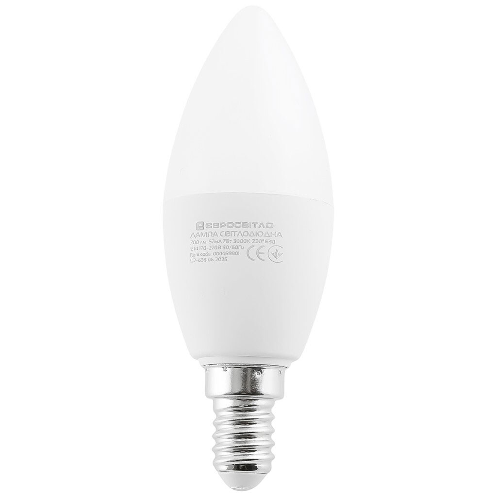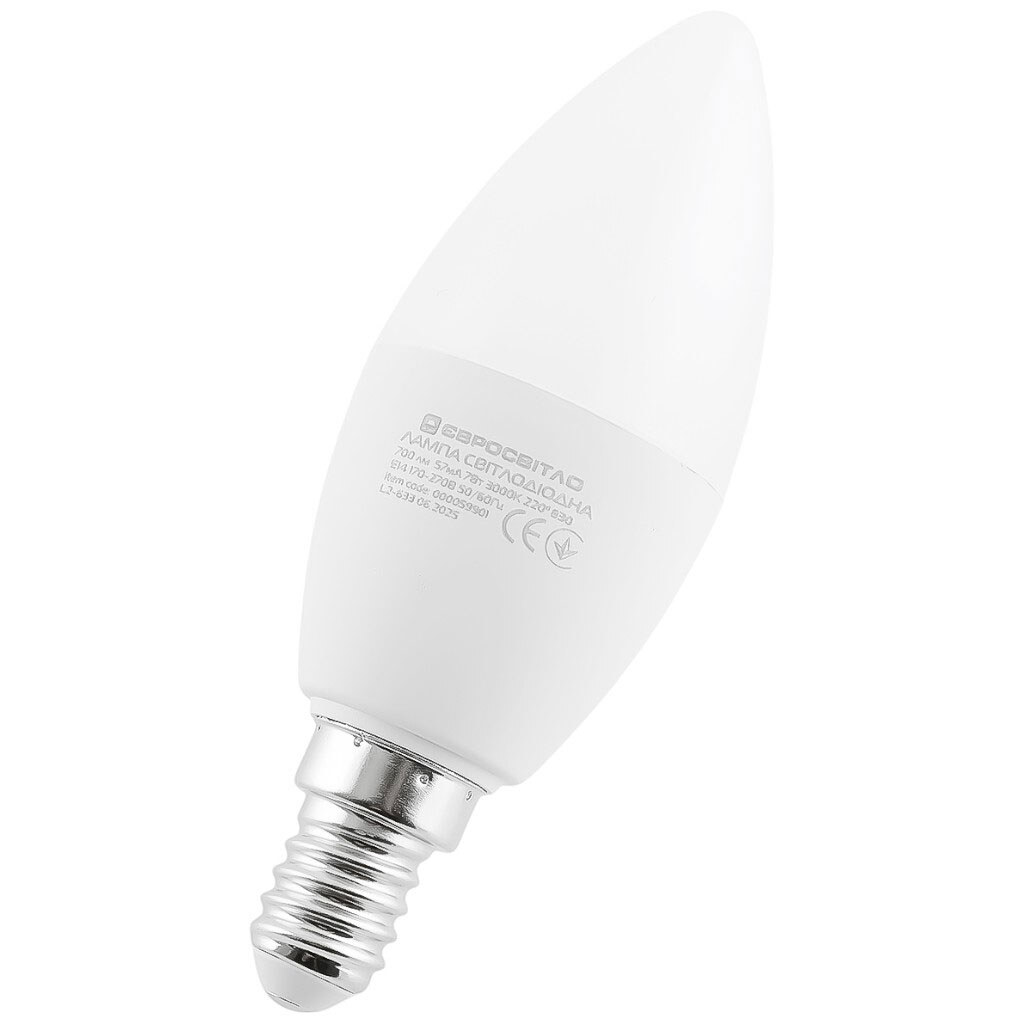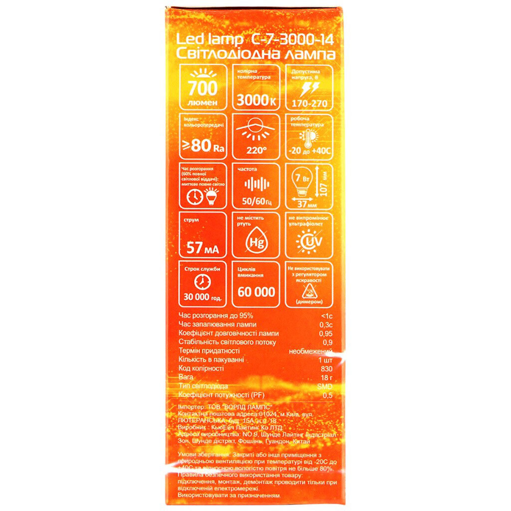 Примечание: Входное напряжение, V: 170-270 | Гарантийный термин: 24 месяца | Диаметр: 3,7 см | Длина: 10,7 см | Количество циклов включения (On/Off): 60 000 | Цвет свечения: Теплый свет | Цветопередача (Качество света): Ra>80 | Страна производитель: Китай | Мощность, W: 7 Вт | Ресурс часов: 30 000 | Рассеиватель | 220° | Световой поток, Lm: 700 Lm | Температура свечения: 4200K | Цоколь: E14 | Время запуска: 0,3 сек