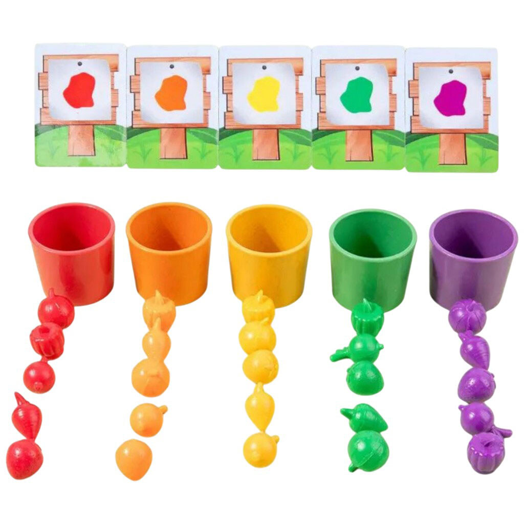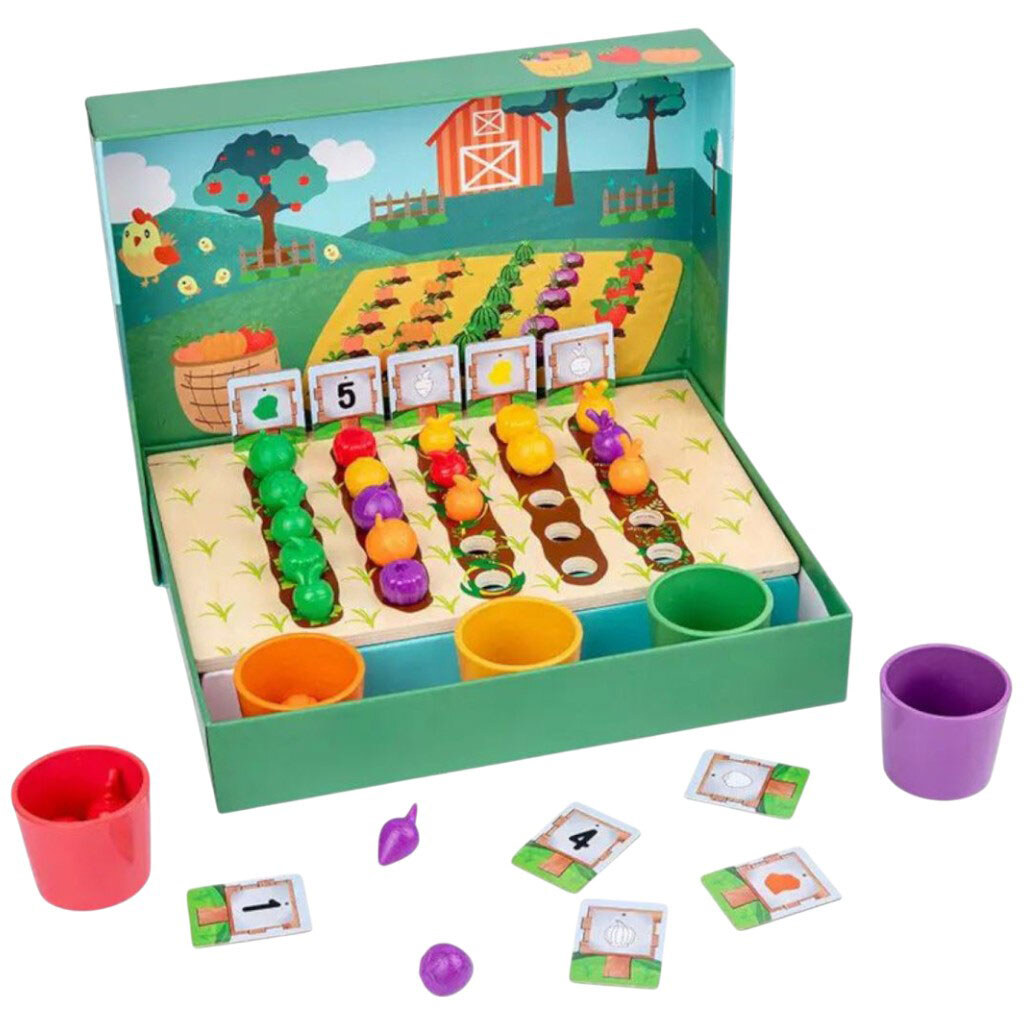 Логическая игра: деревянная основа, 5 чаш для сортировки, 25 резиновых овощей, 10 двусторонних карт с заданиями, Mic
