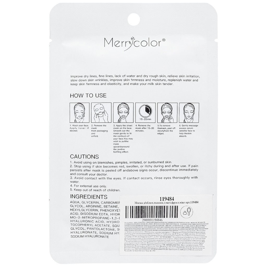 Примечание: Количество в упаковке, шт: 1 | Класс косметики: Масс-маркет | Страна производитель: Китай | Пол: Для женщин | Тип кожи: Для всех типов Форма выпуска: Тканевая