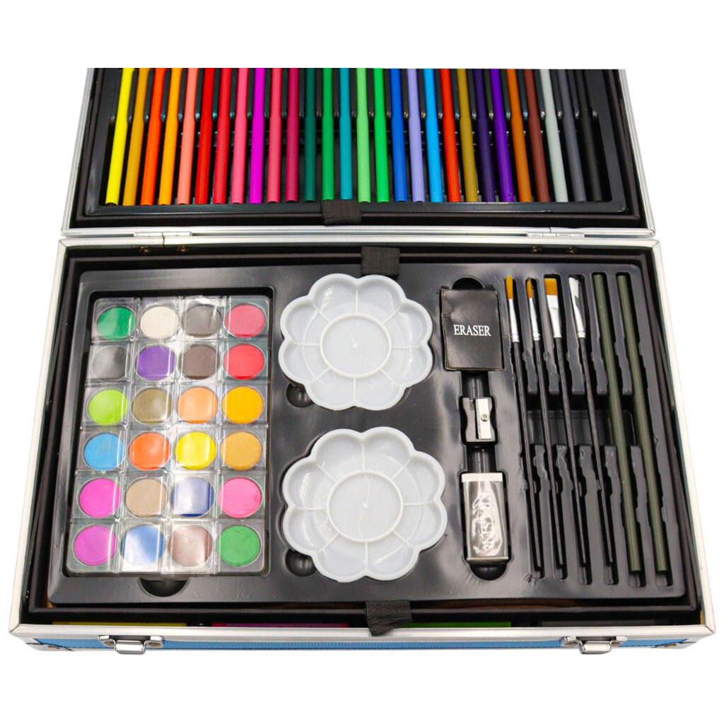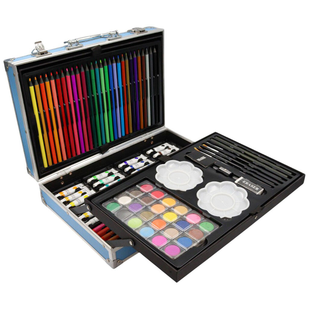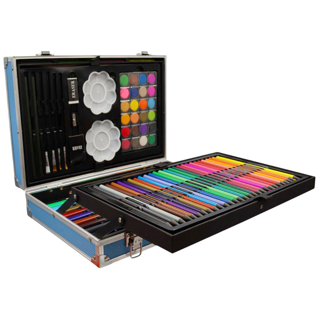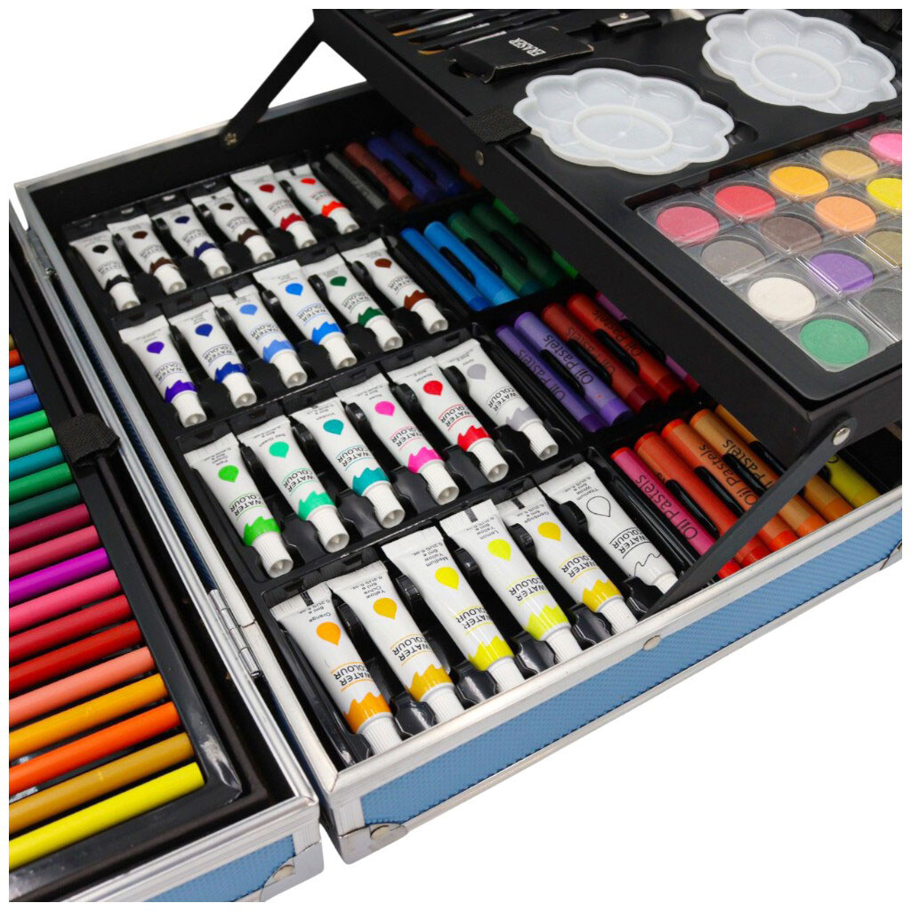 Примечание: Комплектация: Карандаши (28 шт), маркеры (33 шт), восковый мел (24 шт), масляные краски (24 шт), акварель (24 цвета), набор кистей (4 шт), две палитры, резинка (2 шт), подстругачка | Страна производитель: Китай | Назначение: Канцелярские принадлежности | Размер: 25х34х9 см | Пол ребенка: Унисекс
