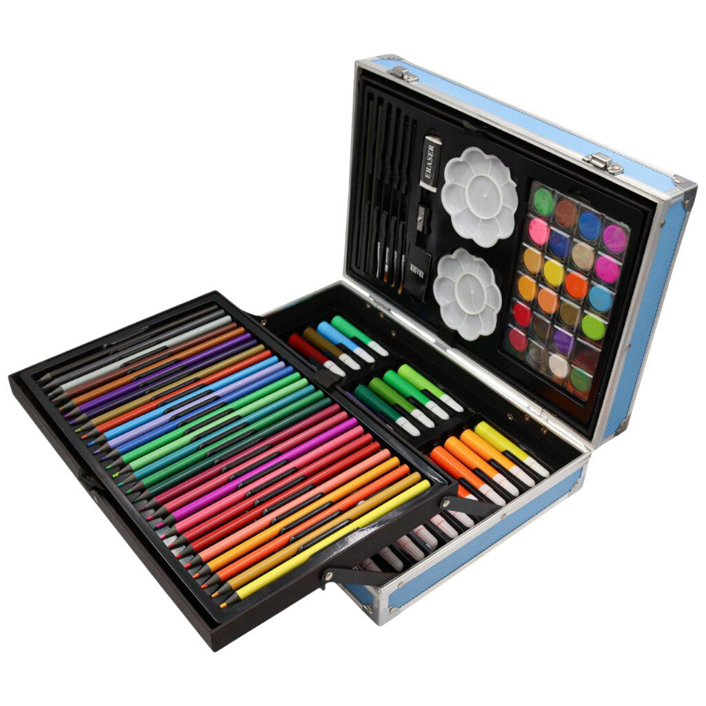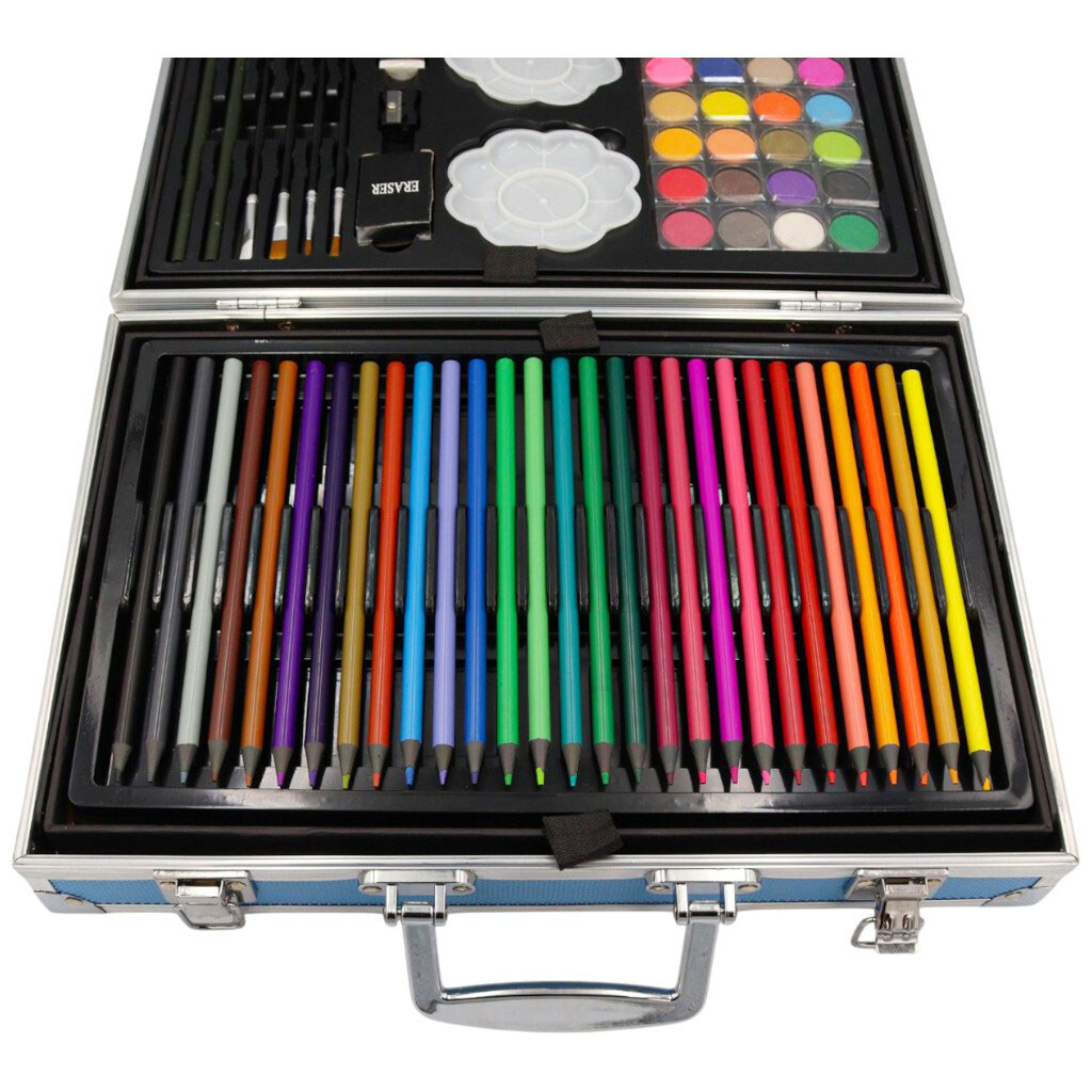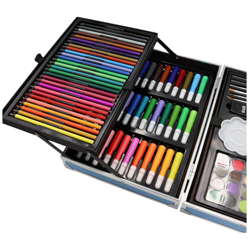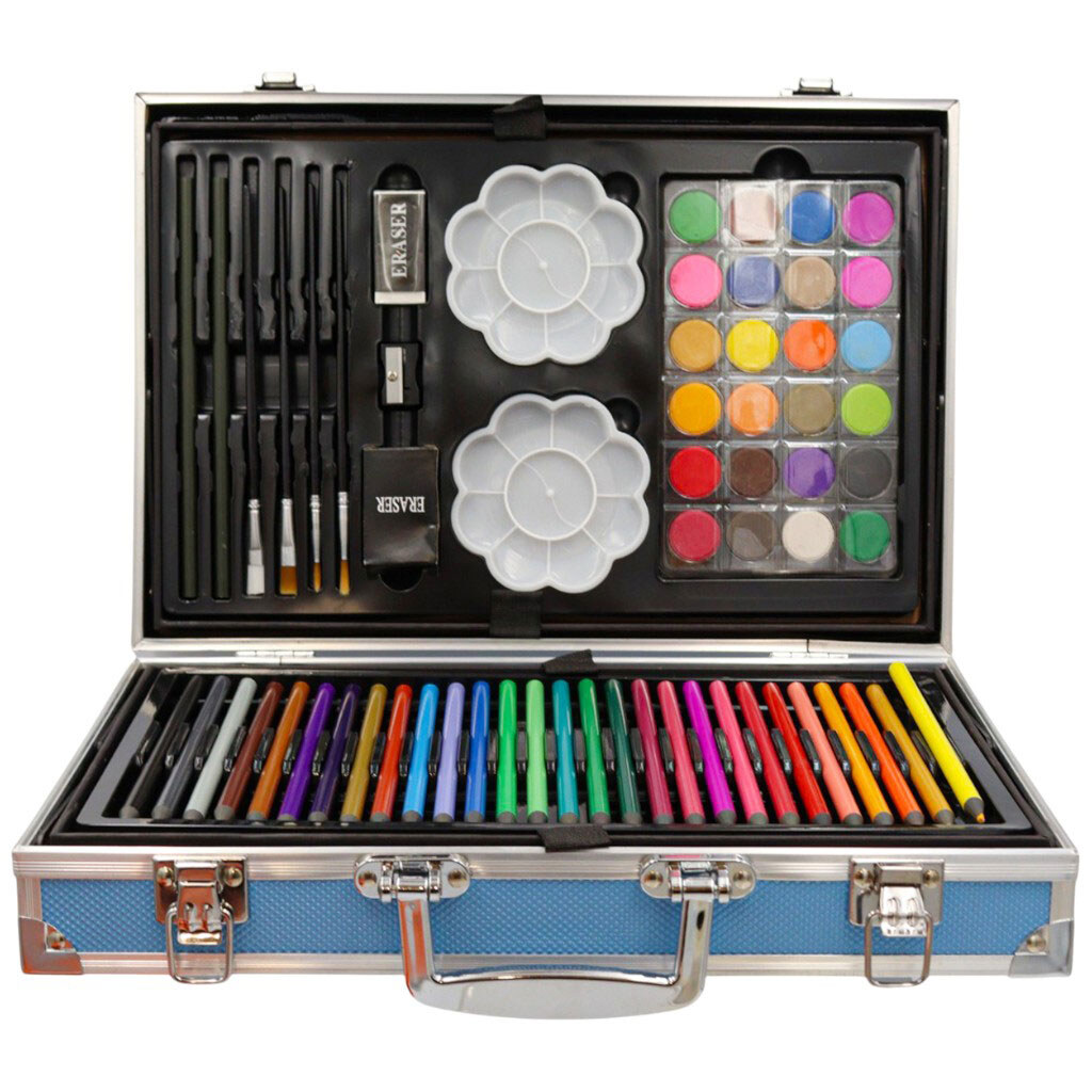 Примечание: Комплектация: Карандаши (28 шт), маркеры (33 шт), восковый мел (24 шт), масляные краски (24 шт), акварель (24 цвета), набор кистей (4 шт), две палитры, резинка (2 шт), подстругачка | Страна производитель: Китай | Назначение: Канцелярские принадлежности | Размер: 25х34х9 см | Пол ребенка: Унисекс