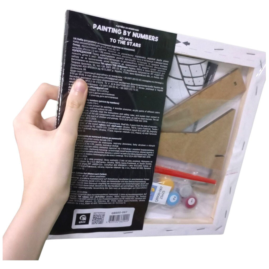 Примечание: Упаковка: Пленка | Габариты в упаковке: 25 x 25 x 1.5 см | Габариты без упаковки: 25 x 25 x 1.5 см | Страна производитель: Украина | Комплектация: холст на подрамнике с галерейной натяжкой, художественные нейлоновые кисти, палитра акриловых красок в контейнерах, деревянные детали подставки для картины