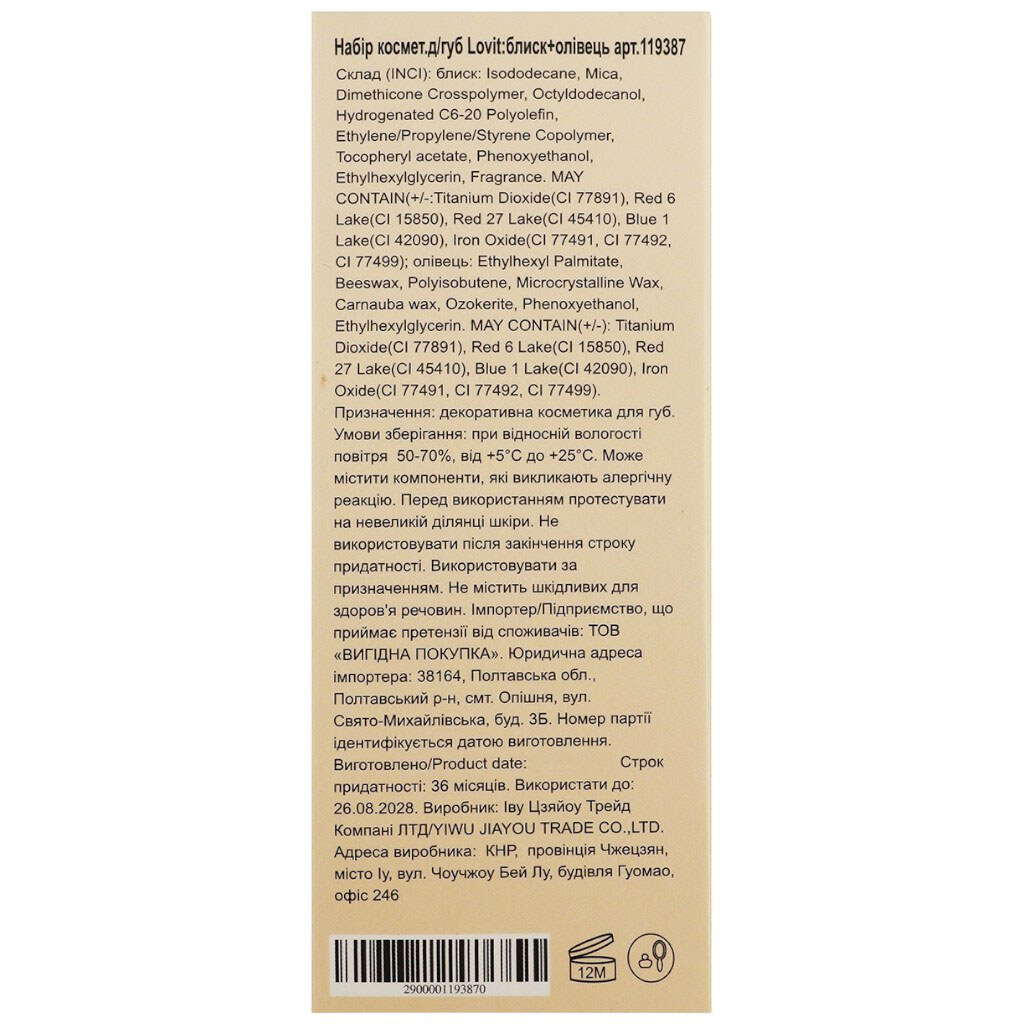 Примечание: Карандаши для губ | Количество в упаковке, шт: 2 | Класс косметики: Масс-маркет | Комплектация: Блеск для губ, карандаш для губ | Страна производитель: Китай | Назначение: Декоративная косметика