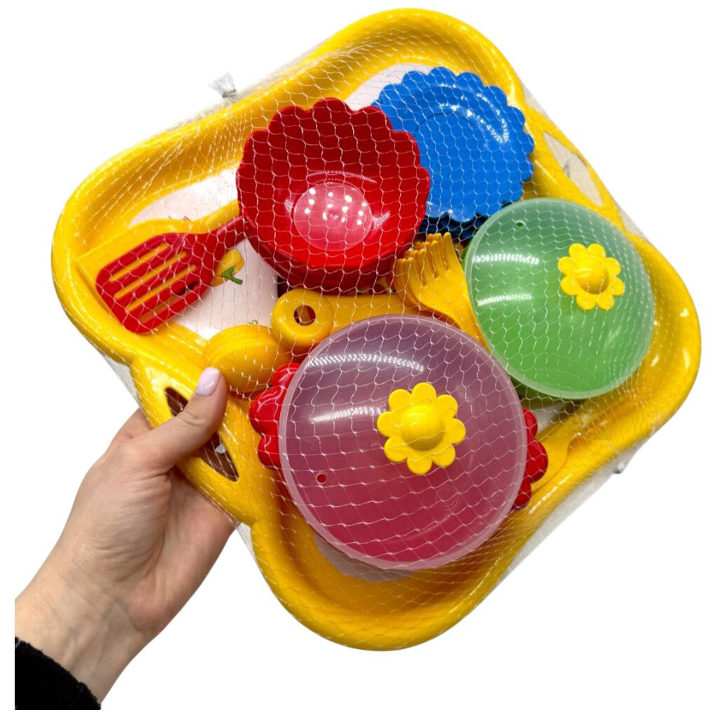 Примечание: Упаковка: Сетка | Вес в упаковке: 385 г | Габариты в упаковке: 8 x 29 x 29 см | Страна производитель: Украина | Комплектация: Поднос, 4 мисочки, 4 тарелочки, 4 ложки, 4 вилки, 4 ножа, 2 лопатки, кастрюля и сковородка с крышечкой