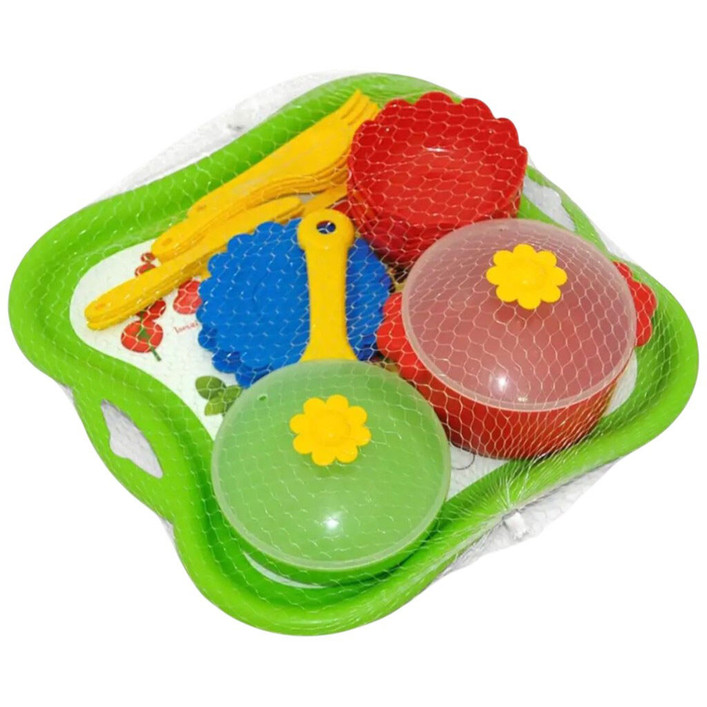 Примечание: Упаковка: Сетка | Вес в упаковке: 385 г | Габариты в упаковке: 8 x 29 x 29 см | Страна производитель: Украина | Комплектация: Поднос, 4 мисочки, 4 тарелочки, 4 ложки, 4 вилки, 4 ножа, 2 лопатки, кастрюля и сковородка с крышечкой