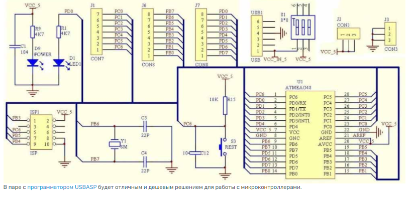 Набор для самостоятельной сборки минимальной отладочной платы для микроконтроллеров ATmega8, ATmega48 и других совместимых по контактам. В набор входит: