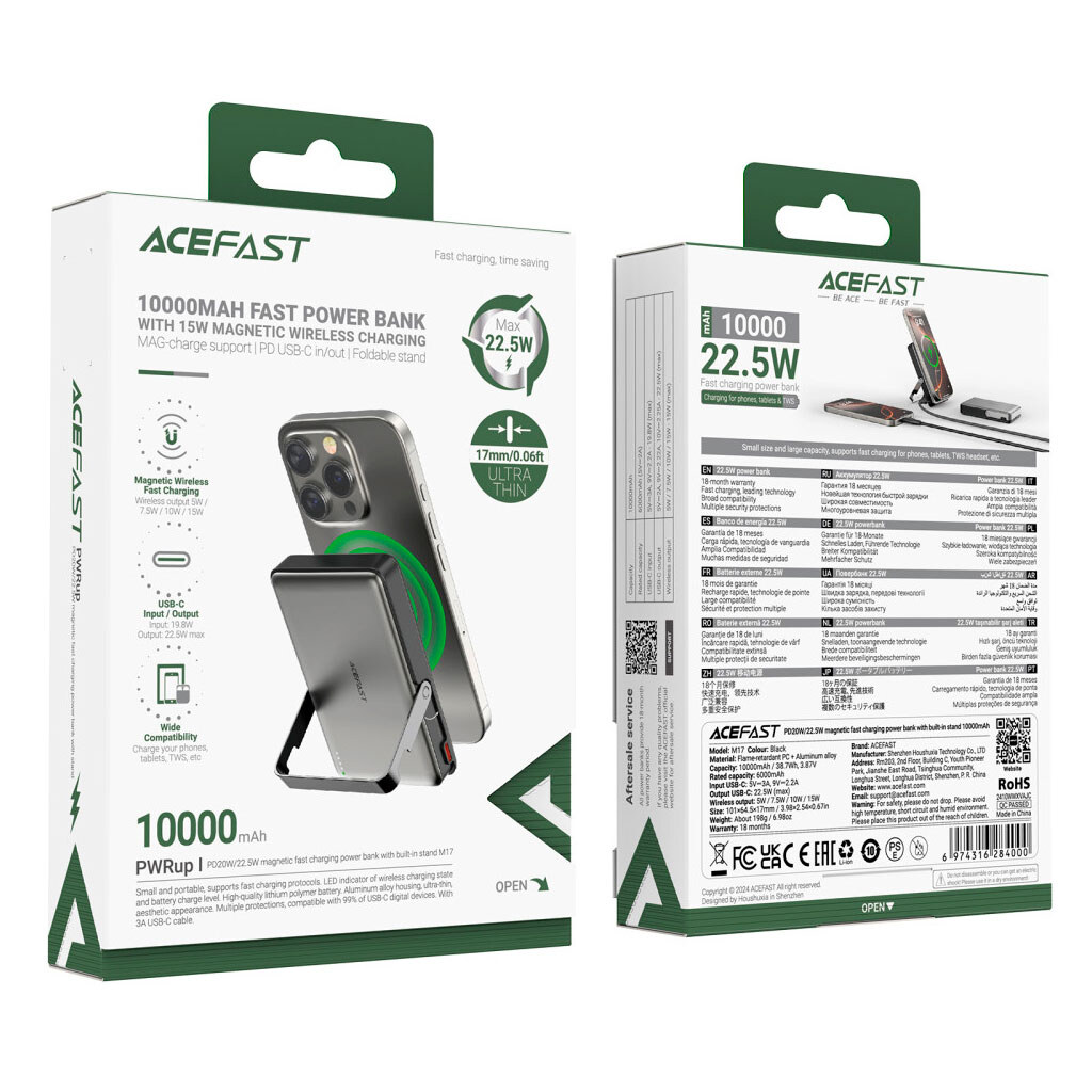 Купить портативные зарядные устройства. Какая гарантия на Портативная батарея (Power Bank) AceFast M17, 10000 mAh, Черный?