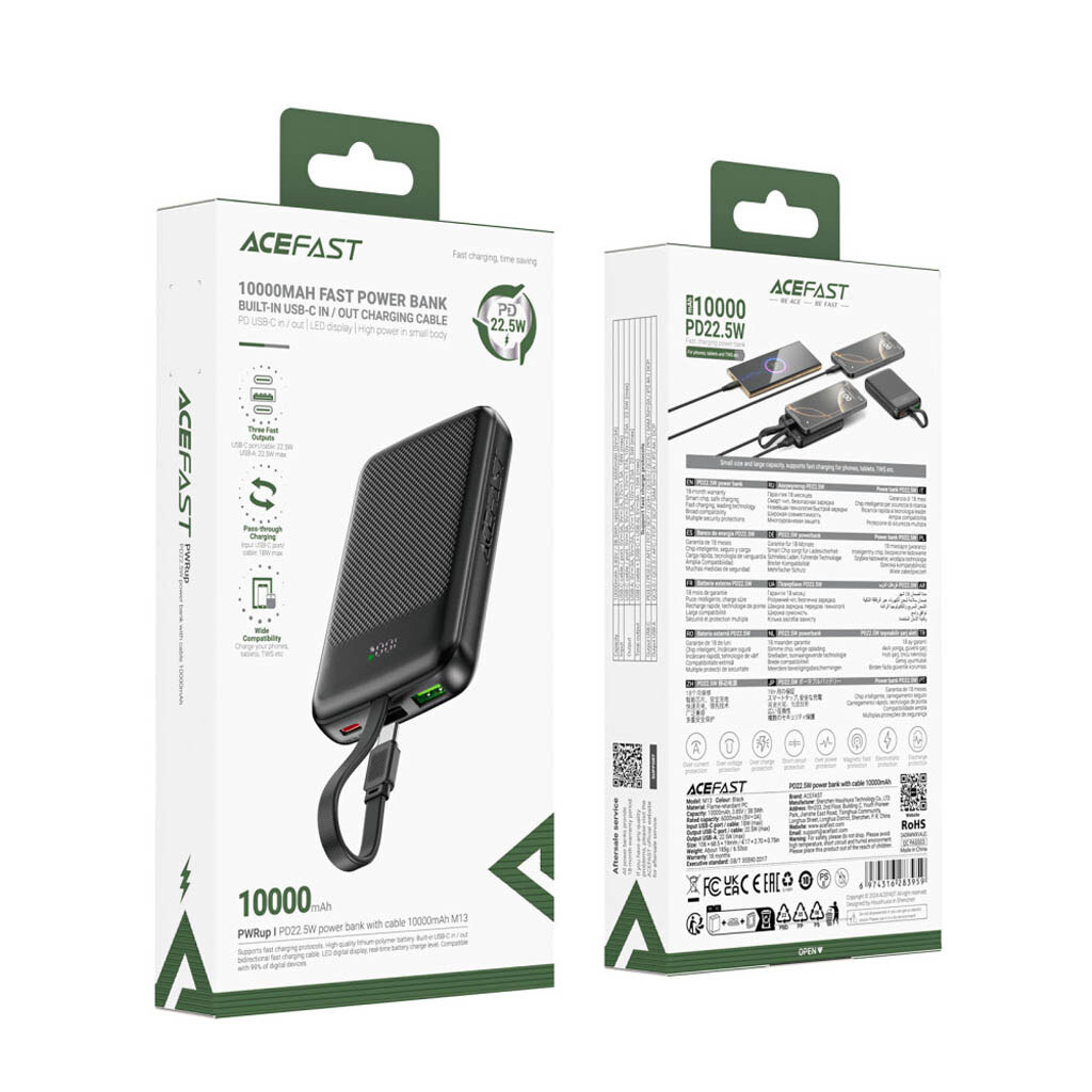Купить портативные зарядные устройства. Какая гарантия на Портативная батарея (Power Bank) AceFast M13, 10000 mAh, Черный?