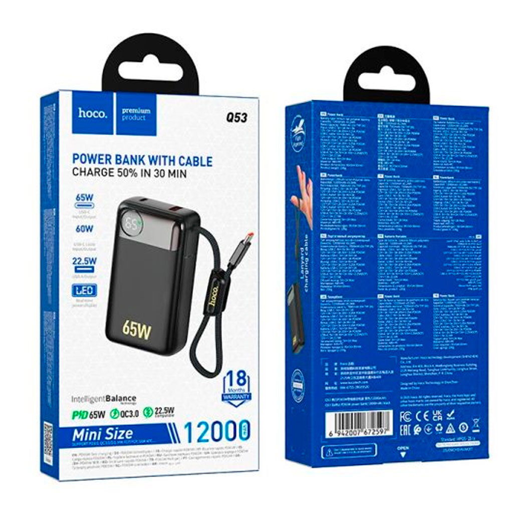 Купить портативные зарядные устройства. Какая гарантия на Портативная батарея (Power Bank) Hoco Q53, 12000 mAh, Черный?