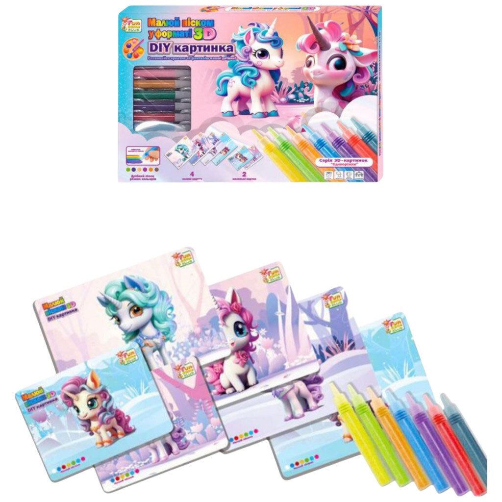Рисуй песком "Единорожки", 6 карточек, 6 цветов песка, щетка, в коробке, 4FUN Game Club