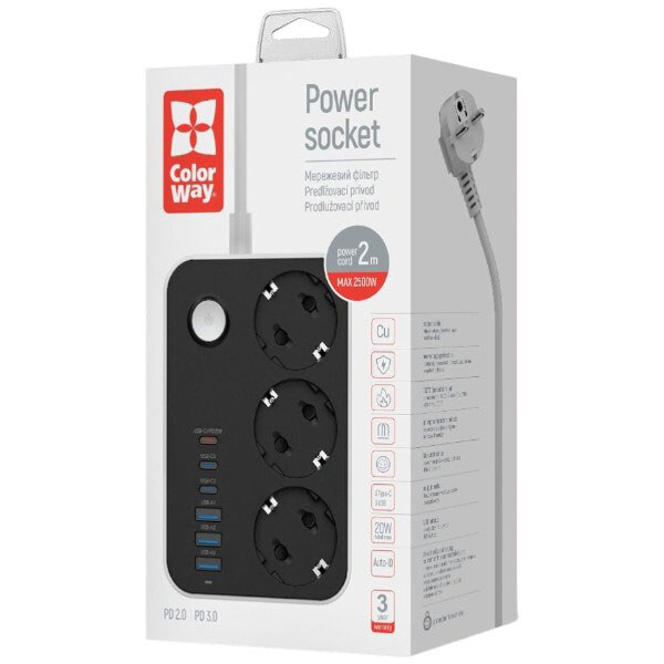 Сетевой удлинитель ColorWay CW-CHE36PDB, 2.0 м., Черный