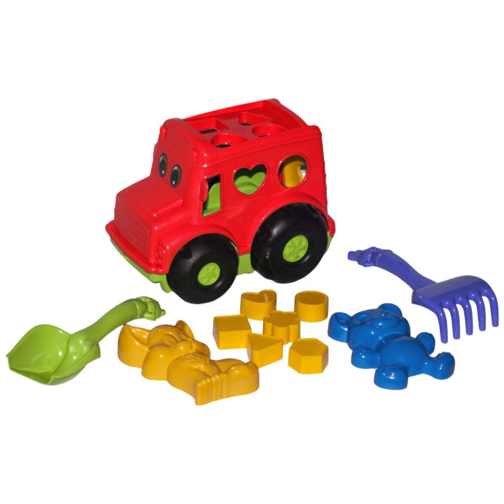 Примечание: Упаковка: Сетка | Вес в упаковке: 308 г | Габариты в упаковке: 23 x 11 x 15 см | Габариты без упаковки: 23 x 11 x 15 см | Страна производитель: Украина | Комплектация: Автобус, две пасочки, лопатка, грабельки, фигурки для сортера