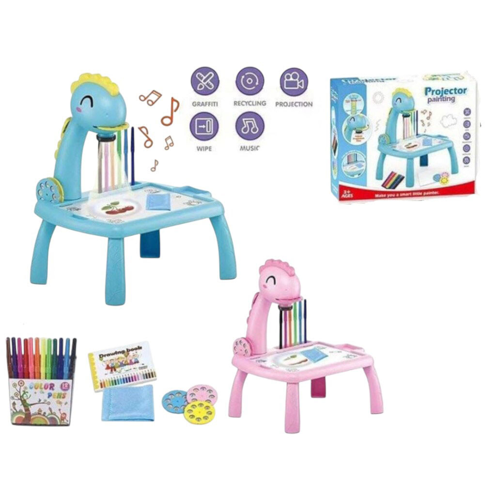 Столик с проектором, "Динозавр", 3 диска, фломастеры, салфетка, на батарейках, музыка, подсветка, в коробке, Rui Feng