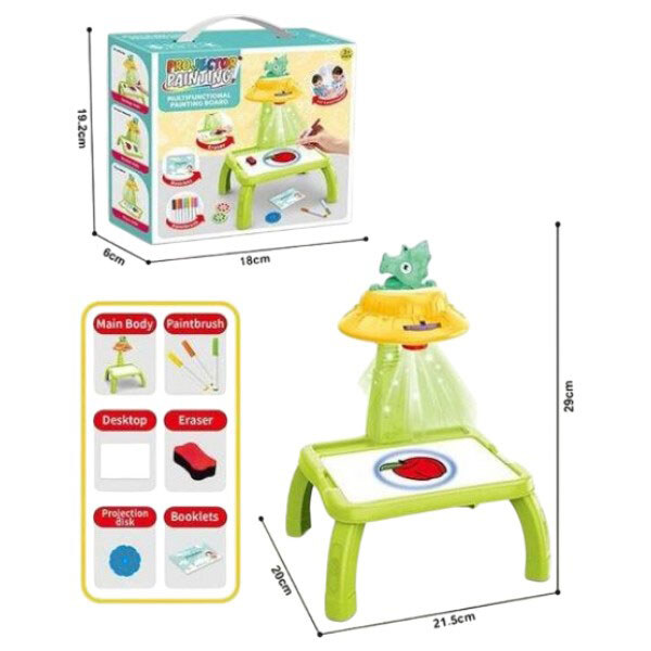 Примечание: Упаковка: Коробка | Тип эл-тов питания: Батарейки,ААА | Кол-во эл-тов питания: 3 | Эл-ты питания в комплекте: Нет | Вес в упаковке: 205 г | Габариты в упаковке: 6.3 x 19.5 x 18.2 см | Страна производитель: Китай | Комплектация: столик с проектором, аксессуары