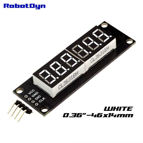 Примечание: Бренд::: RobotDyn | Габаритные размеры, мм:: 46x14 | Цвет свечения:: Белый | Высота символа, мм:: 9.14 | Схема включения:: TM1637