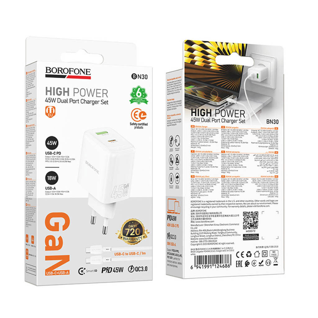 СЗУ Borofone BN30 Cargador, С кабелем, Type-C, Белый