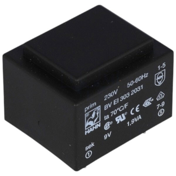 Примечание: Мощность (P), ВА 1.9 | Напряжение вторичной обмотки, канал 1 (Uвтор1), В 9 В | Максимальный ток вторичной обмотки, канал 1 (Iвтор1), А 0.211 | Напряжение первичной обмотки (Uперв), В 230 | Габаритные размеры (LxWxH), мм 32.5x27.5x23.8 | Электрический монтаж на плату, THT | Механический монтаж на плату, THT | Вес (m), г 81