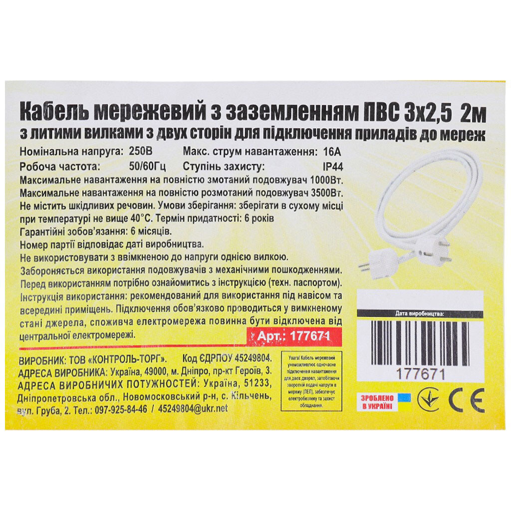 Примечание: Входящее напряжение, V: 250 | Длина: 2 м | Комментарий: Степень защиты IP44. Максимальная нагрузка на полностью смотанный удлинитель 1400 ВТ. Максимальная нагрузка на полностью размотанный удлинитель 3500 Вт. | Коннекторы: 2 вилки | Страна происхождения: Украина | Особенности: С заземлением Сила тока, А: 16
