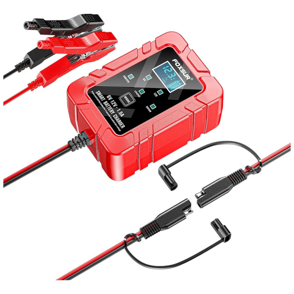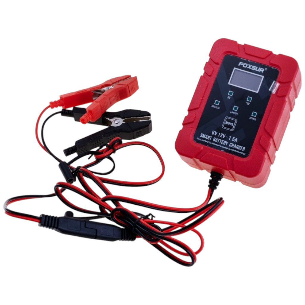Примечание: Описание: Многофункциональное 7-ступенчатое автоматическое зарядное устройство с LCD-дисплеем для 6V/12V свинцово-кислотных аккумуляторов (AGM, GEL, WET, Calcium, Deep Cycle, VRLA) и LiFePO4 емкостью 4Ah–30Ah. Режимы: 6V/12V, AGM/STD, LiFePO4, Repair (16h) – восстановительный режим для старых или сульфатированных батарей. Процесс зарядки состоит из 7 этапов: десульфатации, мягкий старт, основной заряд, абсорбция, тест, восстановительный заряд, поддержка. LCD-дисплей показывает напряжение, ток, состояние заряда, ошибку подключения и завершение процесса. Защита от оборотной полярности. Вход 100-240V 50/60Hz, выход 6V или 12V, ток 1.5A, пассивное охлаждение, габариты 120x85x55мм. | U вх: 100...240 VAC | U исх: 6/12 VDC | Ток вых: 1,5 A | Мощность: 30 W | Габариты: 120x85x55 mm | Вариант выполнения: Зарядное устройство для свинцово-кислотных