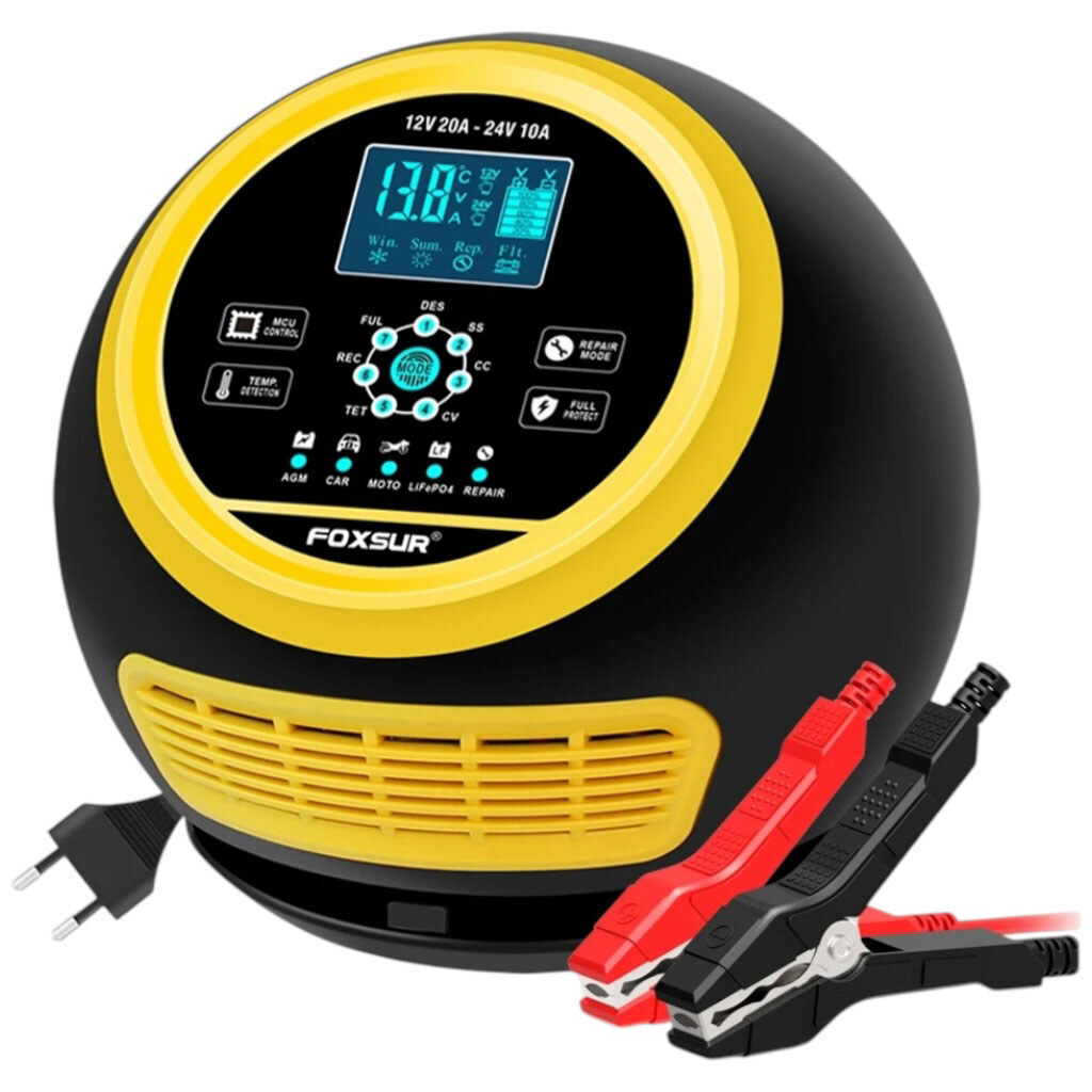 Примечание: Описание: Мощное 7-ступенчатое автоматическое зарядное устройство для 12V/24V свинцово-кислотных AGM, STD, GEL, EFB, Deep Cycle и литиевых LiFePO4 аккумуляторов 6Ah–300Ah. Функции: Full Automatic Battery Maintainer – автоматическое определение напряжения и поддержка заряда, Winter Trickle Charger – режим зимней подзарядки с температурной компенсацией, Intelligent Pulse Repair – восстановление сульфатированных и разряженных батарей, автоматический переход в поддерживающий режим после полного заряда. Защита от перегрева, короткого замыкания, перезаряда, обратного подключения. Вход 100-240V 50/60Hz, выход 12V/20A, 24V/10A, минимальное стартовое напряжение >5.0V, активное охлаждение, габариты 200x190x195мм.