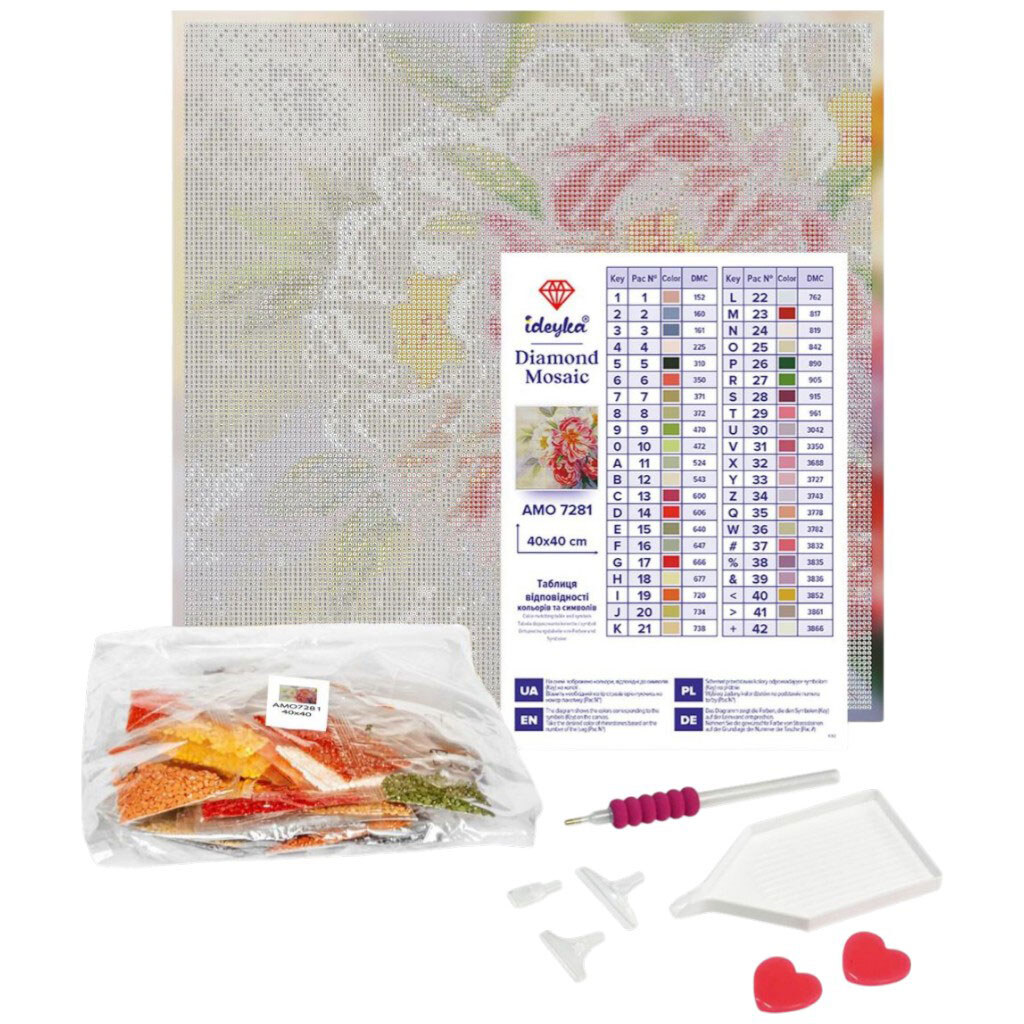 Примітка: Упаковка: Плівка | Габарити в упаковці: 2 x 40 x 40 см | Габарити без упаковки: 2 x 40 x 40 см | Країна виробник: Україна | Комплектація: полотно із зображенням, ручка-стилус, гель-клей, акрилові стрази згідно комплектації набору