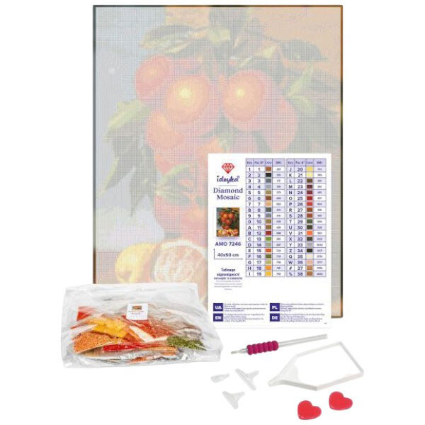 Примітка: Габарити в упаковці: 50 x 40 x 1 см | Країна виробник: Україна | Комплектація: Склад набору: - полотно з клейовим шаром та кольоровою схемою, оформлене на підрамник галерейним способом, - акрилові стрази згідно комплектації набору (круглі), - спеціальна ручка--стилус для роботи зі стразами з м'яким тримачем і 3 додаткові насадки для нього: для 3-х і 9-ти камінчиків-стразів, і насадка для вирівнювання стразів на полотні, - два гель-клеї, - лоток для сортування стразів, - зип-пакети для стразів, - інструкція. Кольори готової мозаїки можуть трохи відрізнятися від показаних на картинці! Склад набору та аксесуарів, що не впливають на використання та функціональність набору, можуть змінюватися виробником без попередження та відрізнятись від зображених на сайті!