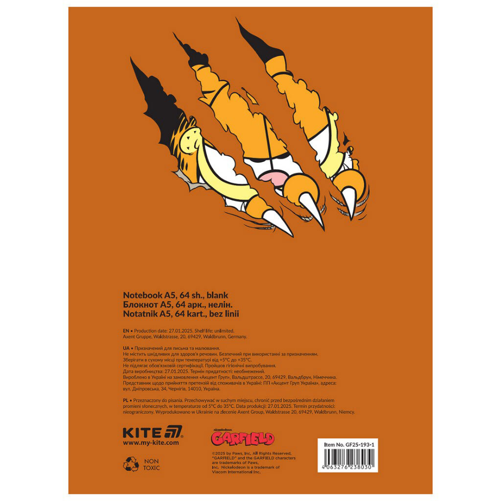 Блокнот А5 термобіндер серія "Garfield", 64 аркуші, Kite
