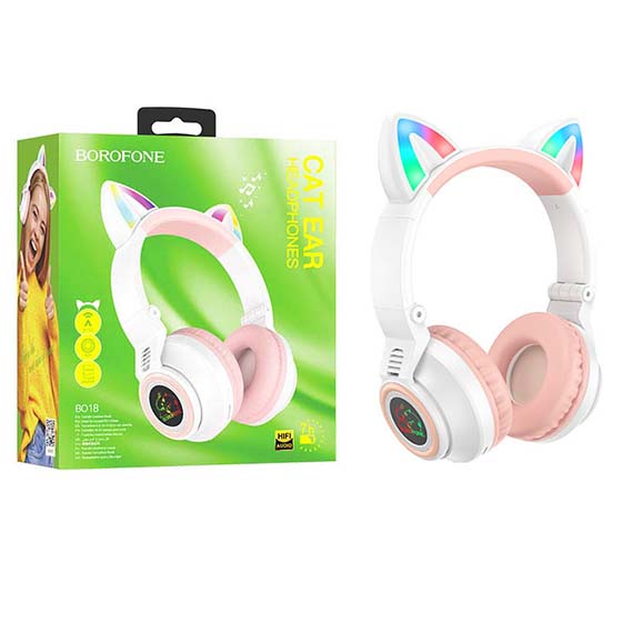 Bluetooth навушники накладні Borofone BO18 Cat Бездротові навушники виділяються серед інших аналогічних моделей неординарною конфігурацією. Їхнє оголов'я прикрашене котячими вушками. У моделі поєднуються переваги класичних повнорозмірних навушників та незвичайні світлові ефекти. Амбушюри повністю закривають вуха, відсікаючи настирливий шум навколишнього світу. У вуха, що грайливо стирчать, інтегровані світлодіоди, які яскраво переливаються.