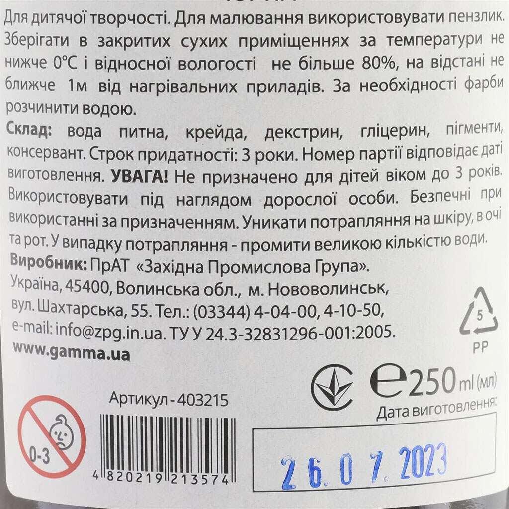 Примітка: Кількість в упаковці, шт: 1 | Колір: Фіолетовий | Коментар: Строк придатності: 36 місяців | Країна виробник: Україна | Об'єм: 250 мл | Призначення: Для дитячої творчості