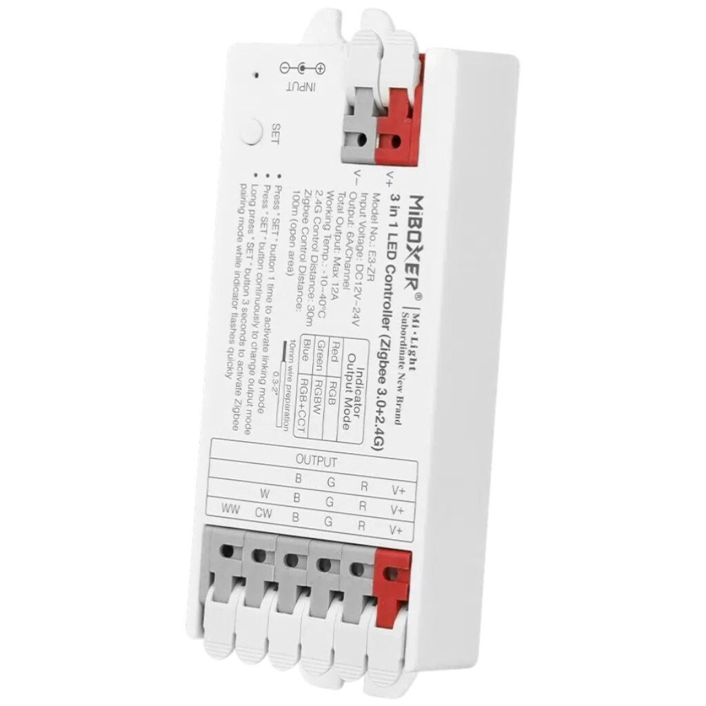 Примітка: Опис: Багатофункціональний контролер освітлення Zigbee 3.0+2.4G RF. 3 режими виходу: RGB/RGBW/RGB+CCT. Регулювання яскравості, температури та кольору (до 16 млн). Управління через MiBoxer Zigbee Gateway, Google Home. Автоматична ретрансляція до 30 м та синхронізація динамічних режимів. Перемикання PWM High/Low. Сумісний з 2,4G пультами FUT100, FUT089, FUT092, FUT096, B-серії. Підтримка DMX512 (у режимі RGB+CCT). Живлення: 12/24VDC. Струм: 6A на канал (12A на пристрій). Габарити 100x40x17, 6мм.