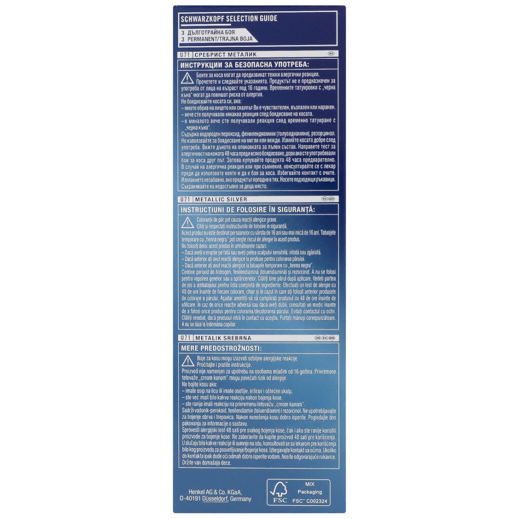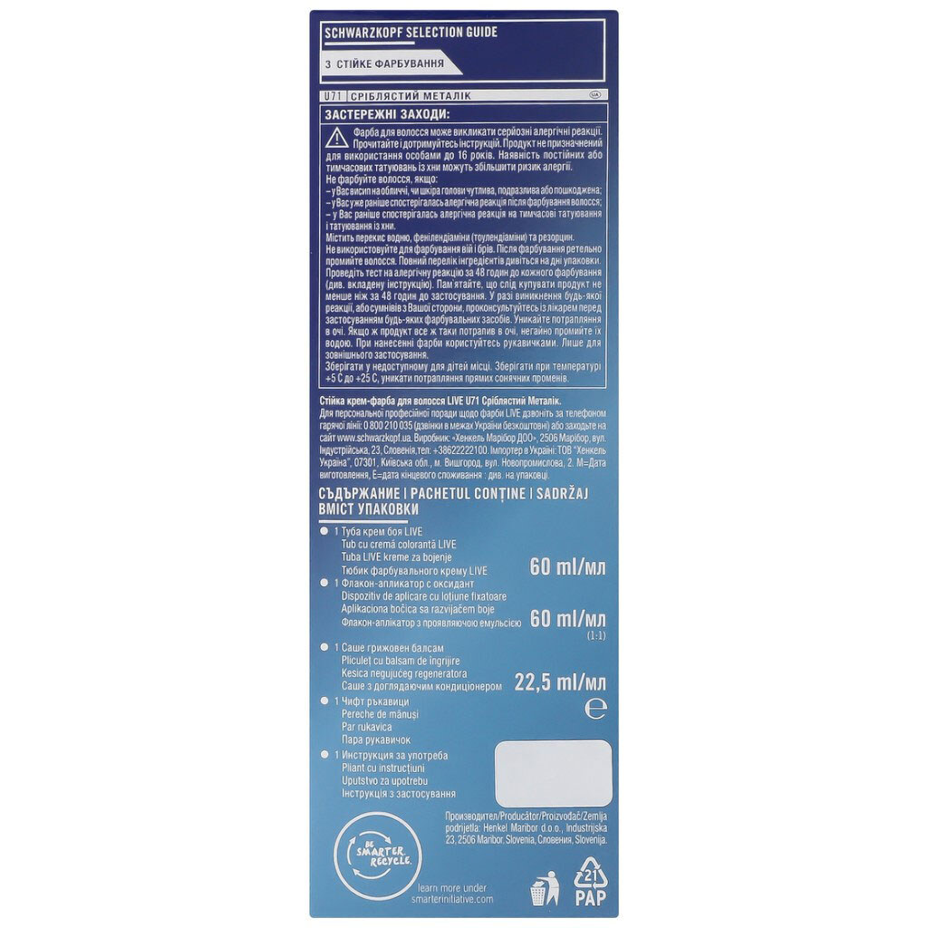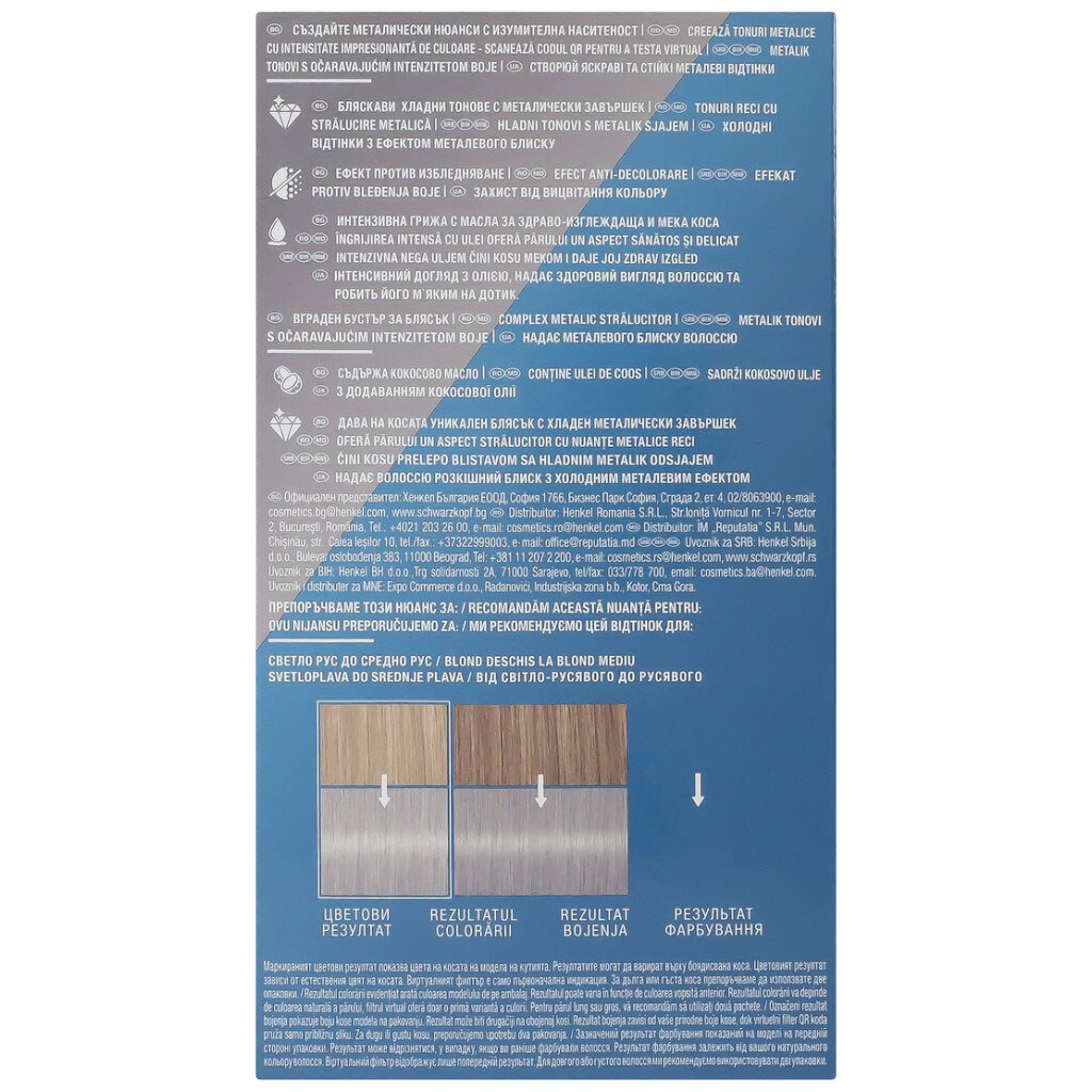 Примітка: Ефект: 100% зафарбовування сивини | Клас косметики: Мідл-маркет | Колір: Сріблястий металік | Комплектація: Фарбувальний крем 60 мл, проявляюча емульсія 60 мл, доглядаючий кондиціонер 22,5 мл, рукавички, інструкція | Країна виробник: Словенія | Особливості: Без аміаку | Призначення: Фарбування | Термін придатності: 36 місяців | Тип волосся: Для всіх типів