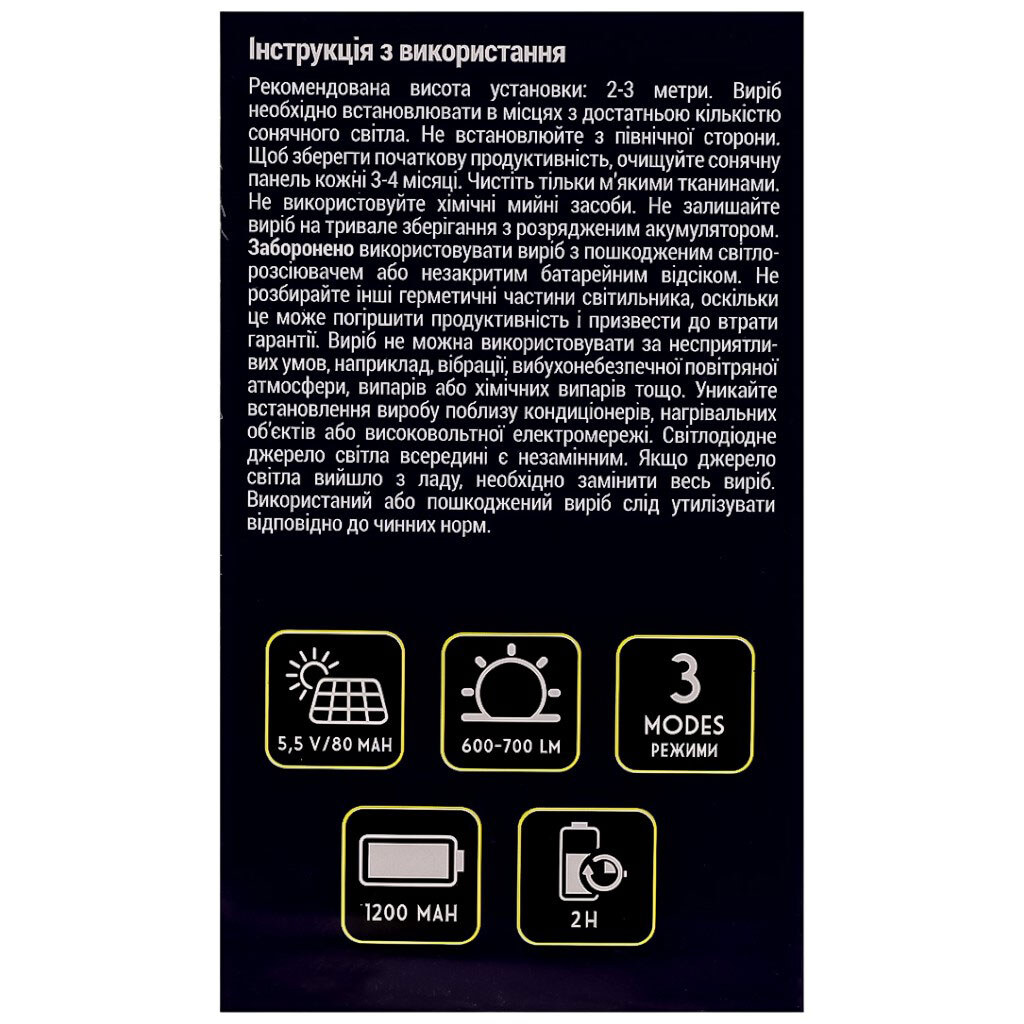 Примітка: Ємність: 1200 mAh | Вхідна напруга, V: 5,5 V | Гарантійний термін: 12 місяців | Живлення: Сонячна батарея | Кількість ламп: 100 LED | Кількість режимів: 3 | Коментар: Включається автоматично з настанням сутінок | Комплектація: Ліхтар, кріплення - 2 шурупи | Країна виробник: Китай | Матеріал: Поліпропілен, полістирол, залізо | Особливості: Має вимикач | Призначення: Для вуличного освітлення | Розмір: 13х6,5х9 см | Світловий потік, Lm: 600-700 Lm | Тип акумулятору: 18650 Li-battery 1200mAh | Час роботи: 2 години