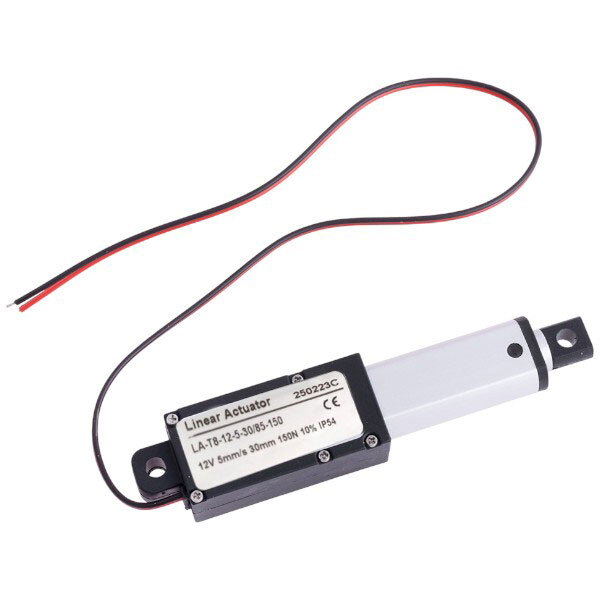 Примітка: Опис: Лінійний двигун. Довжина штока: 30мм. швидкість руху: 5mm/s. Вантажопідйомність: 150N. Напруга живлення: 12VDC. Матеріал: алюміній. Вбудований контроль ліміту висування штока. Клас захисту: IP54. | Тип: лінійний | Напруга живлення В: 12 V