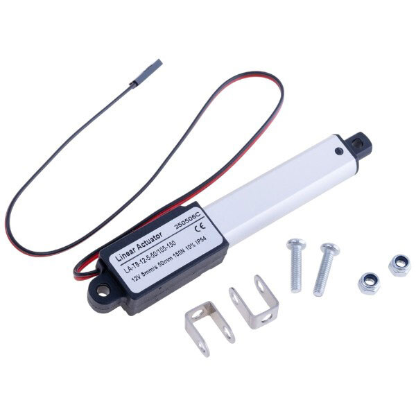 Примітка: Опис: Лінійний двигун. Довжина штока: 50мм. швидкість руху: 5mm/s. Вантажопідйомність: 150N. Напруга живлення: 12VDC. Матеріал: алюміній. Вбудований контроль ліміту висування штока. Клас захисту: IP54. | Тип: лінійний | Напруга живлення В: 12 V