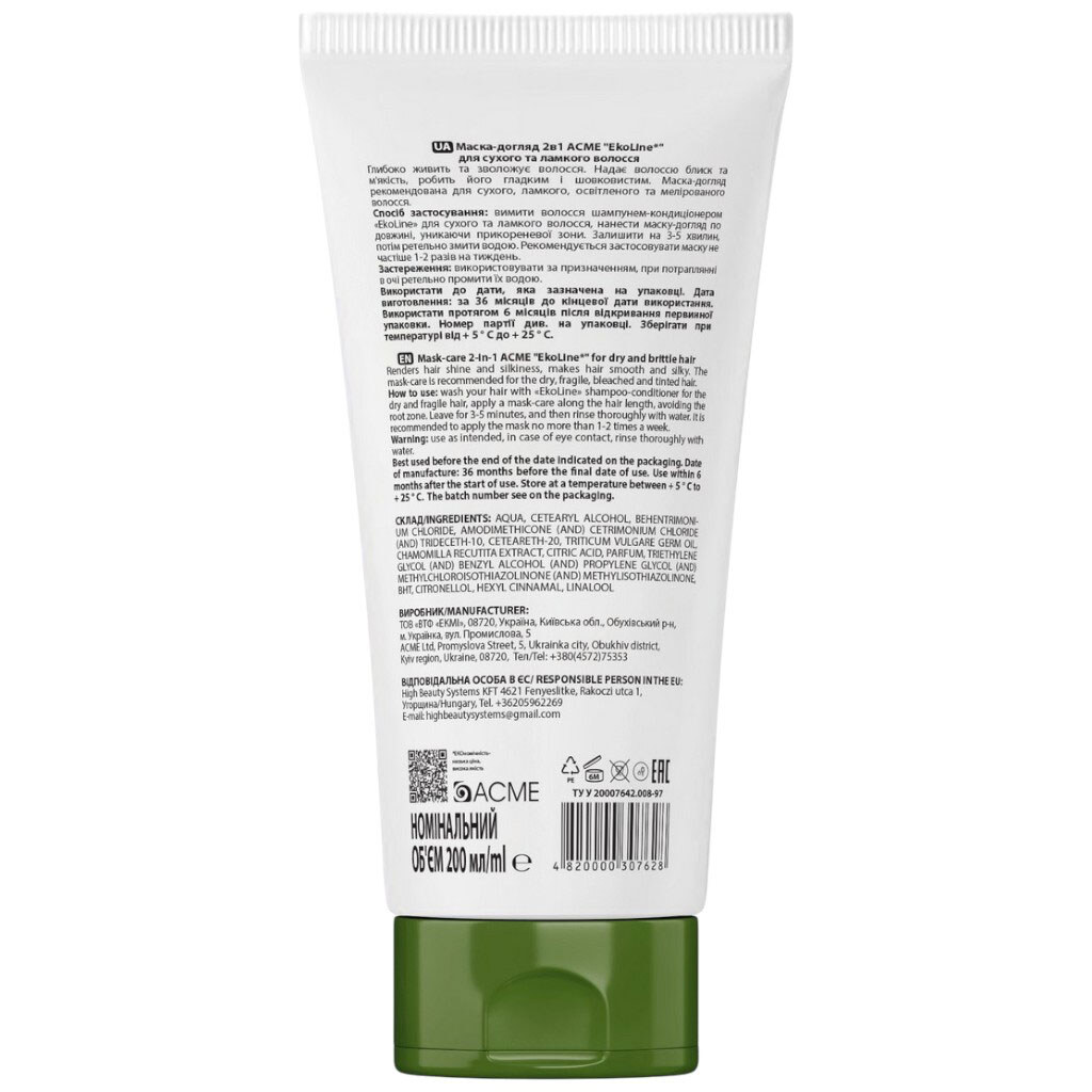 Маска-догляд для сухого та ламкого волосся 2в1 EkoLine, 200 мл