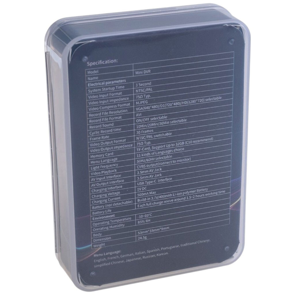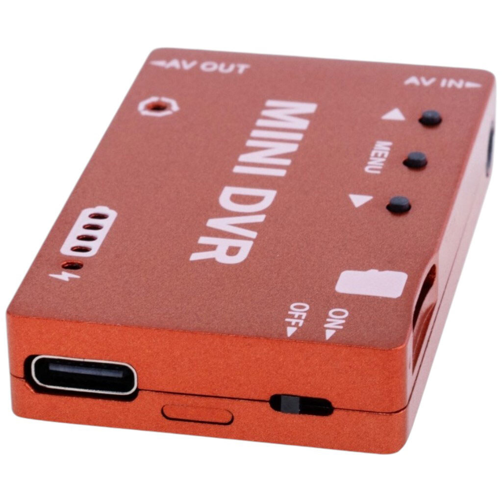 Примітка: Опис: Портативний відеореєстратор FPV. Формат відео на виході: NTSC/PAL. Вхідний опір відео: 75 Ом (типове). Формат стиснення відео: MJPEG. Роздільна здатність запису: VGA (640×480) / D1 (720×480) / HD (1280×720). Формат відеофайлу: AVI. Записування звуку. Циклічний запис: 10 хв/20 хв/30 хв. Кадрова частота: 30 кадрів/с. Карта пам'яті microSD (до 32 ГБ, рекомендується клас 10). Відтворення відео: CVBS вихід. Аудіо вхід/вихід: роз'єм 3.5 мм AV. Інтерфейс заряджання: USB-type C. Акумулятор: вбудований 3,7V/400 mAh. Час роботи: 1,5...2 години. Високоточний 4-рівневий індикатор заряду. Габарити: 53 33 9 мм. Вага: 24,5 g. | Призначення: Інше