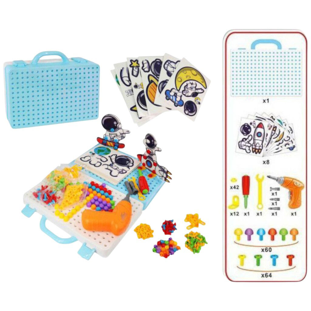Мозаїка, 222 деталі, шуруповерт, мотор, що знімається, реверс, в коробці, Can Xin Long Toys
