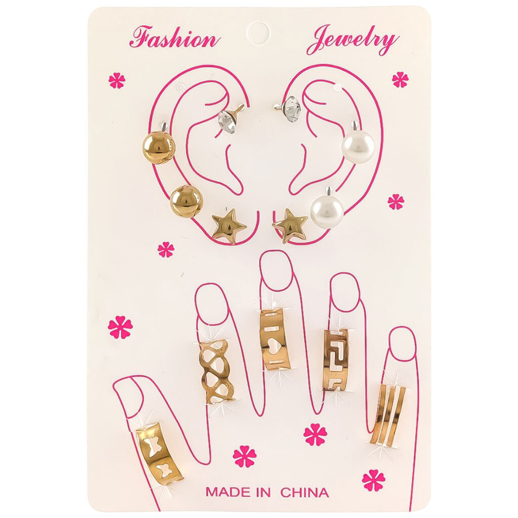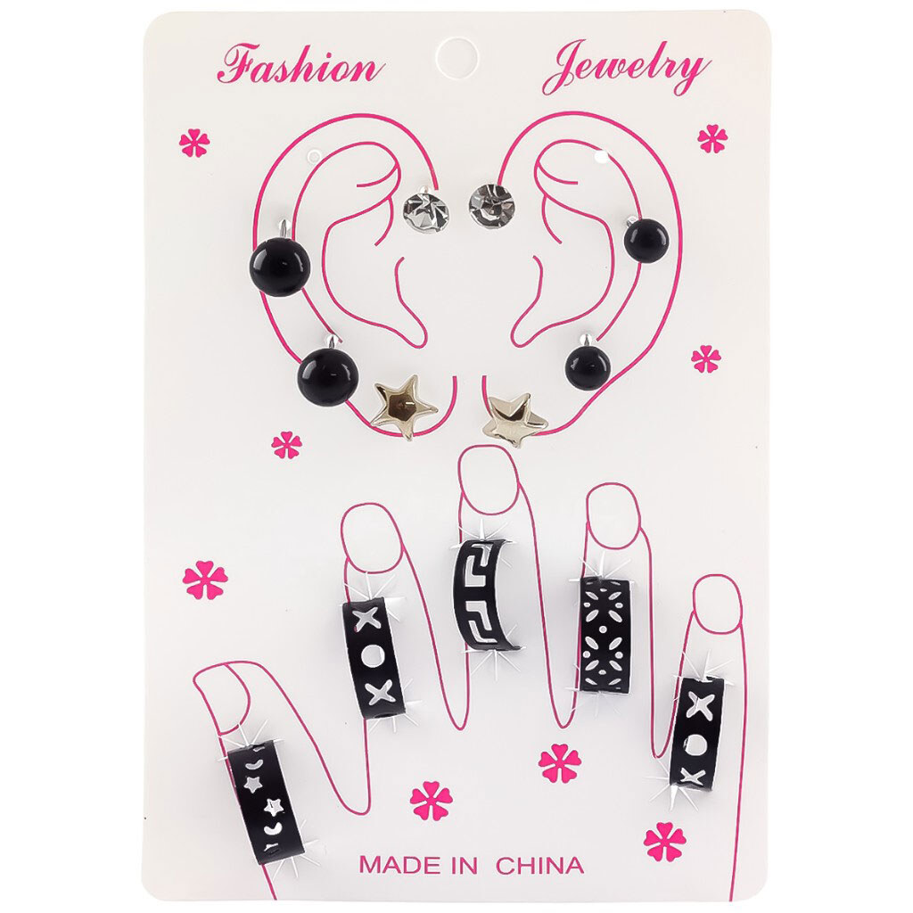 Примітка: Комплектація: Сережки (4 пари), каблучки (5 шт.) | Країна виробник: Китай | Матеріал: Залізо, скло, ссб пластик, абс пластик | Призначення: Прикраси для вух та пальців рук