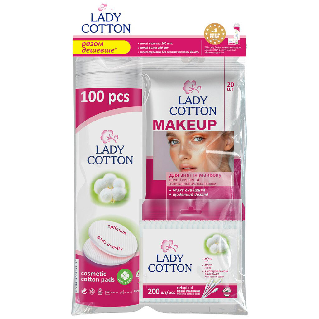 Примітка: Комплектація: Ватні палички - 200 шт, ватні диски - 100 шт, вологі серветки для зняття макіяжу - 20 шт | Країна виробник: Україна | Призначення: Для особистої гігієни