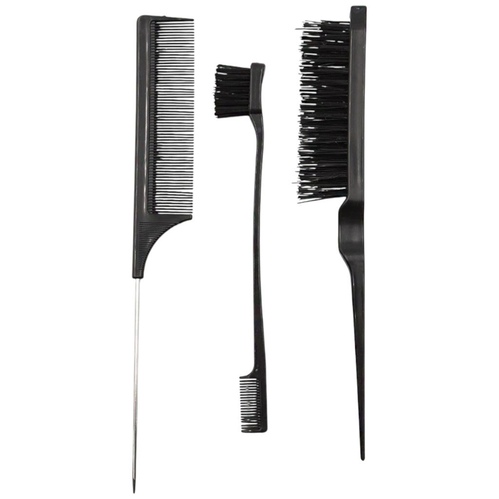 Примітка: Кількість в упаковці, шт: 3 | Країна виробник: Китай | Матеріал: АБС пластик, нейлон, сталь | Розмір: Плоский гребінець: 24х2,8 см, Гребінець для розпушування: 21,5х2,6 см, Пензлик для брів: 17,5х2 см